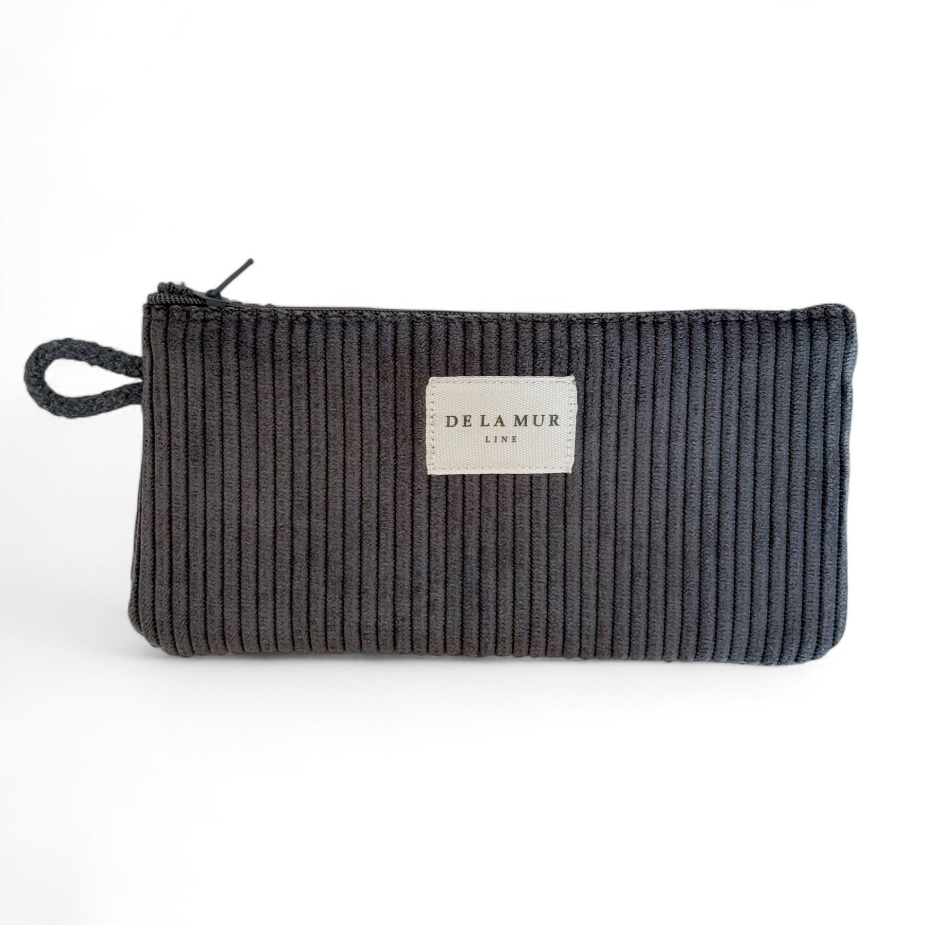 Eyewear case with top zipper and a small dark grey cord handle on the side. Made of thick dark grey corduroy fabric. Each item may vary slightly in pattern depending on where the fabric was cut. Lined with thick grey fabric on the inside. For proper care, hand wash in cold water and do not tumble dry.