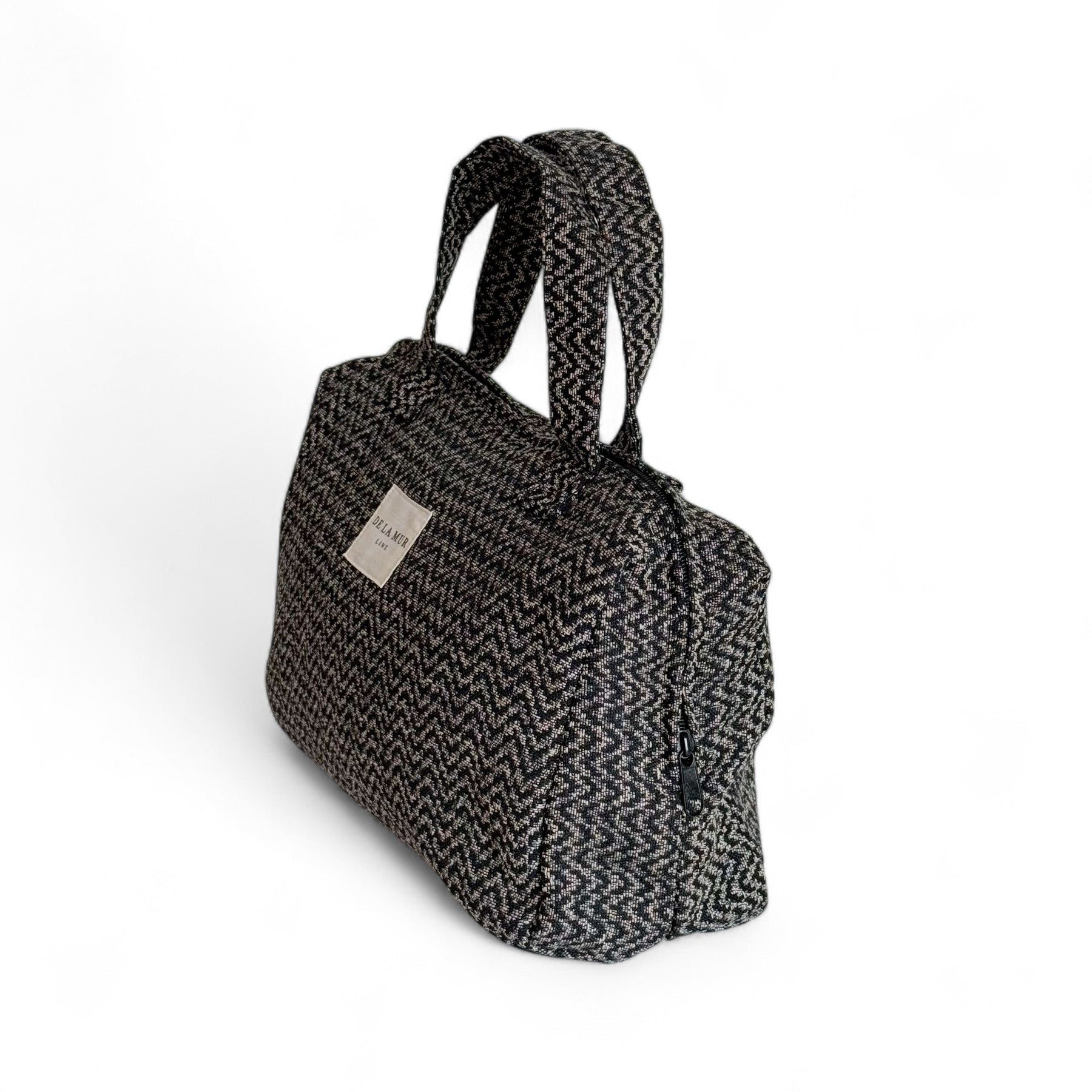Extra-large pouch with a top zipper and fabric handles. Made from thick jacquard fabric with a black and beige zigzag pattern. Lined on the inside with thick gray fabric. For proper care, hand wash in cold water and do not tumble dry.