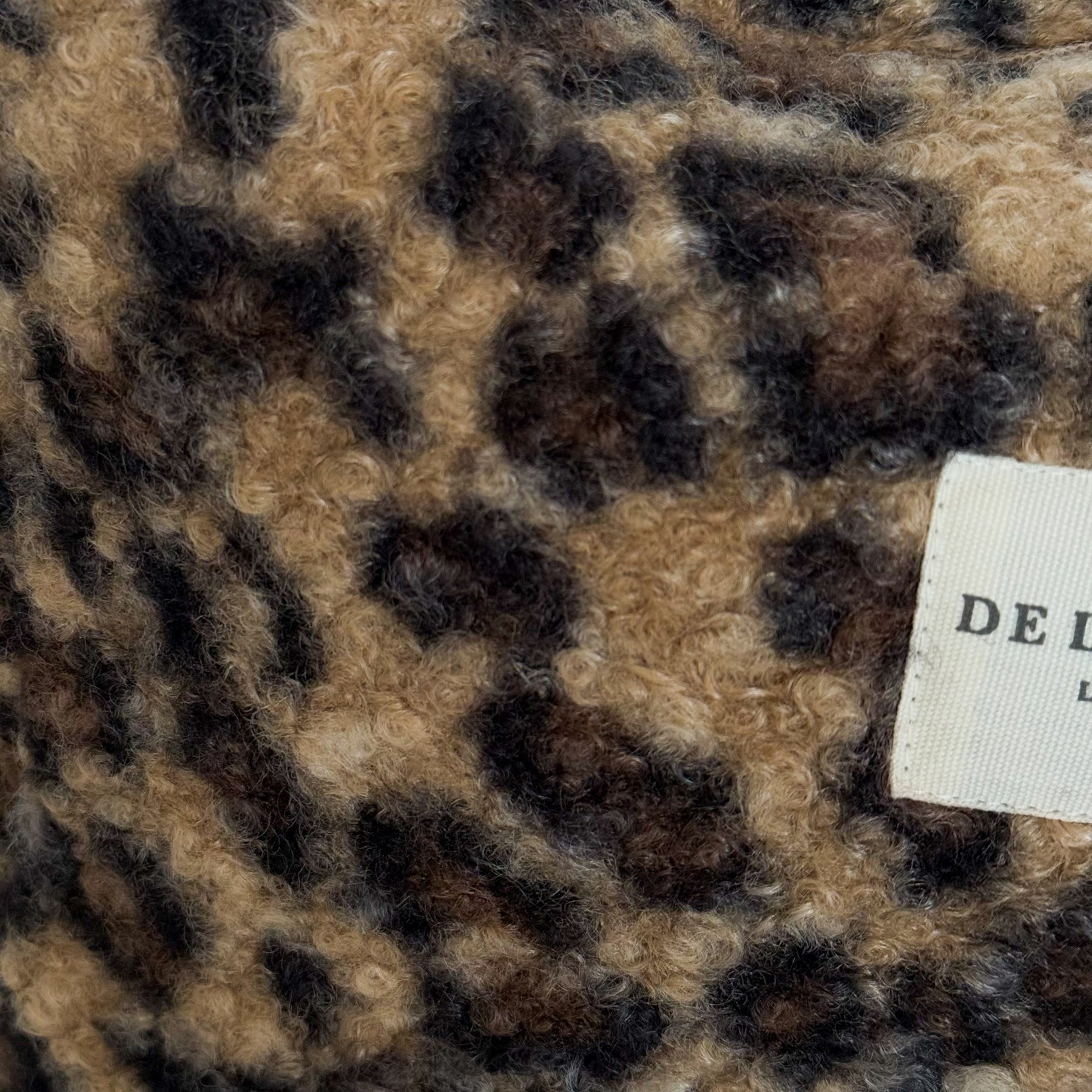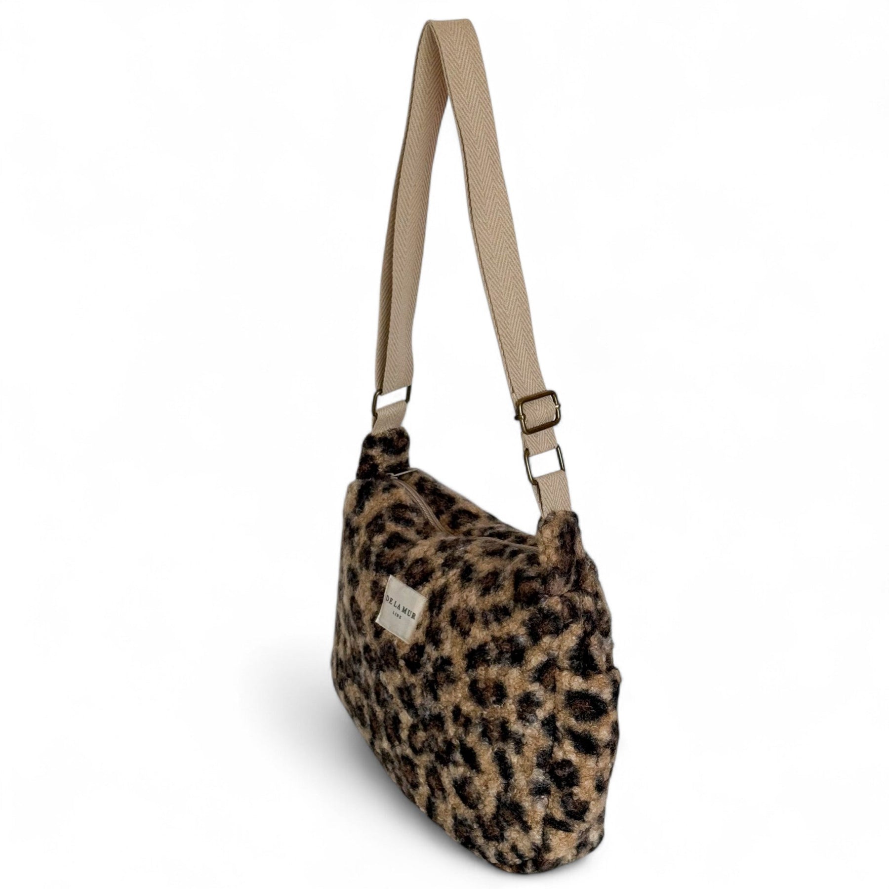 Small crossbody bag with a long, adjustable beige cotton herringbone webbing strap. Zip top closure. Side pockets without zippers. Made with thick leopard-print shearling fabric. Lined with thick gray fabric on the inside. Zippered interior pocket. For proper care, we recommend hand washing in cold water and not using a dryer.