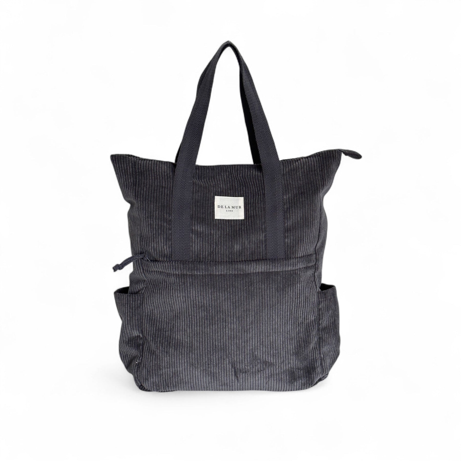 Convertible backpack and shoulder bag with adjustable straps and two top handles to carry it over the shoulder. Made from thick dark grey corduroy upholstery fabric. Interior zip pocket. Dark grey cotton herringbone tape handles. For proper care, wash in cold water and do not tumble dry.