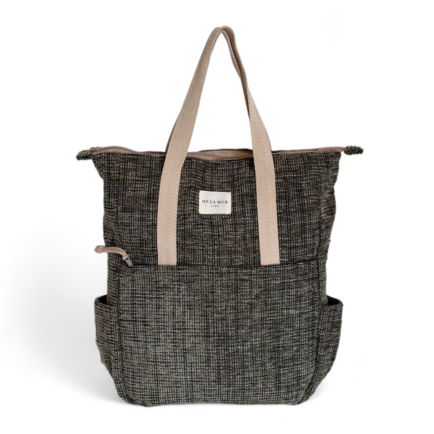 Convertible backpack and shoulder bag with adjustable straps and two top handles to carry it over the shoulder. Made from thick khaki green upholstery fabric. Interior zip pocket. Khaki cotton herringbone tape handles with a broken stripe detail on the sides. For proper care, wash in cold water and do not tumble dry.