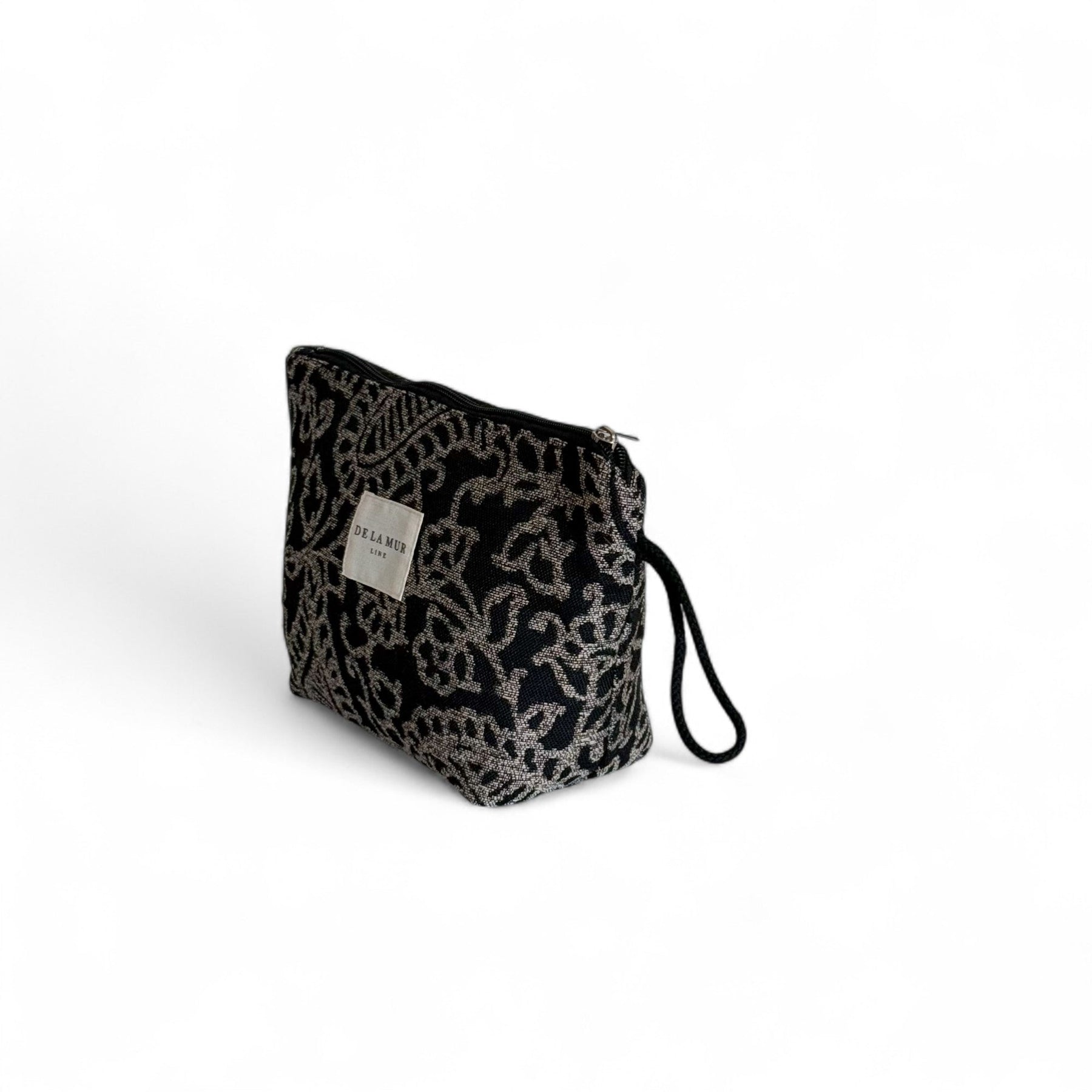 Toiletry bag with a zipper on the top and a black cord handle on the side. Made with thick jacquard fabric with a beige floral print on a black background. Lined with thick gray fabric on the inside. For proper care, we recommend hand washing in cold water and not using a dryer.