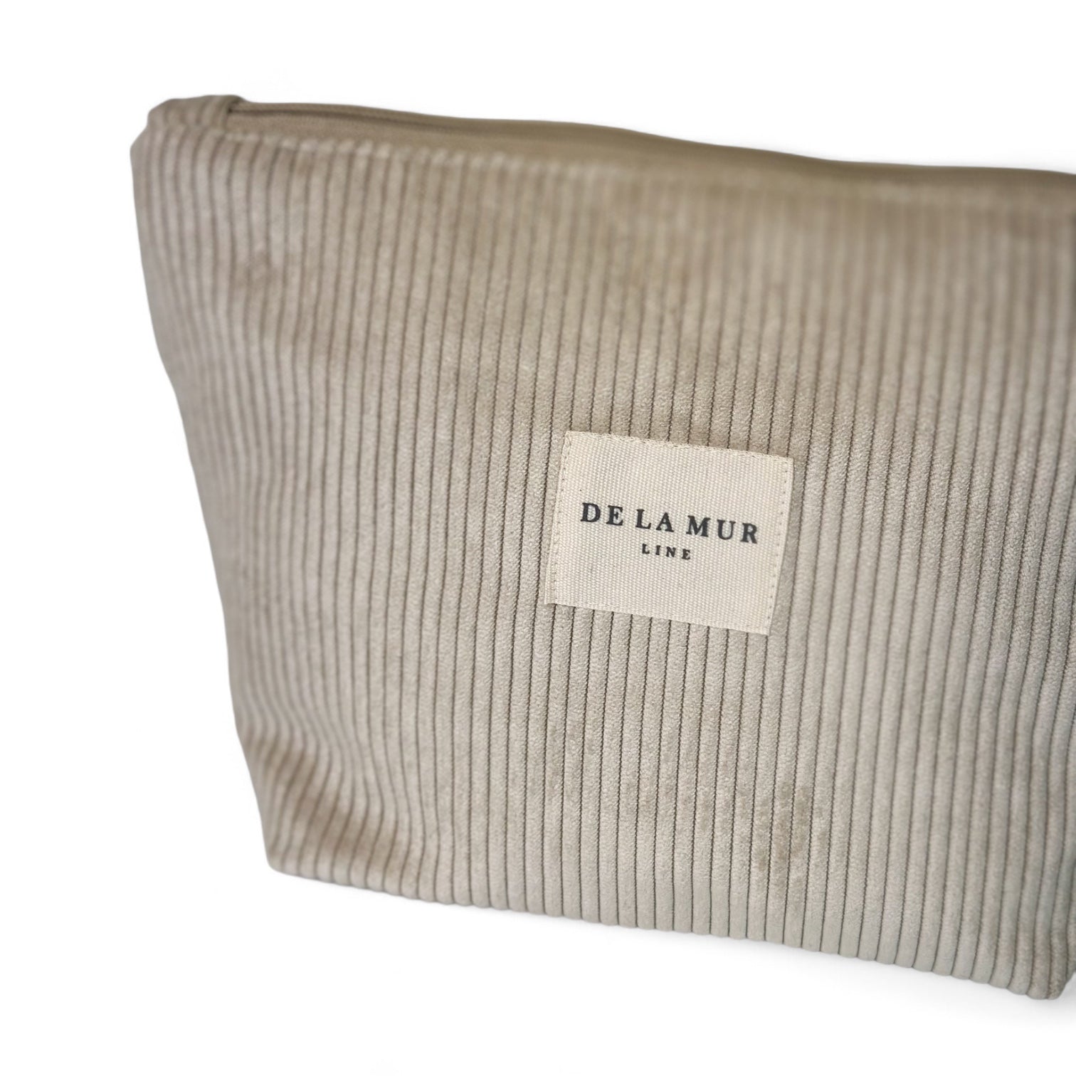 Toiletry bag with a zipper on the top and a beige cord handle on the side. Made with thick beige corduroy fabric. Lined with thick gray fabric on the inside. For proper care, we recommend hand washing in cold water and not using a dryer.