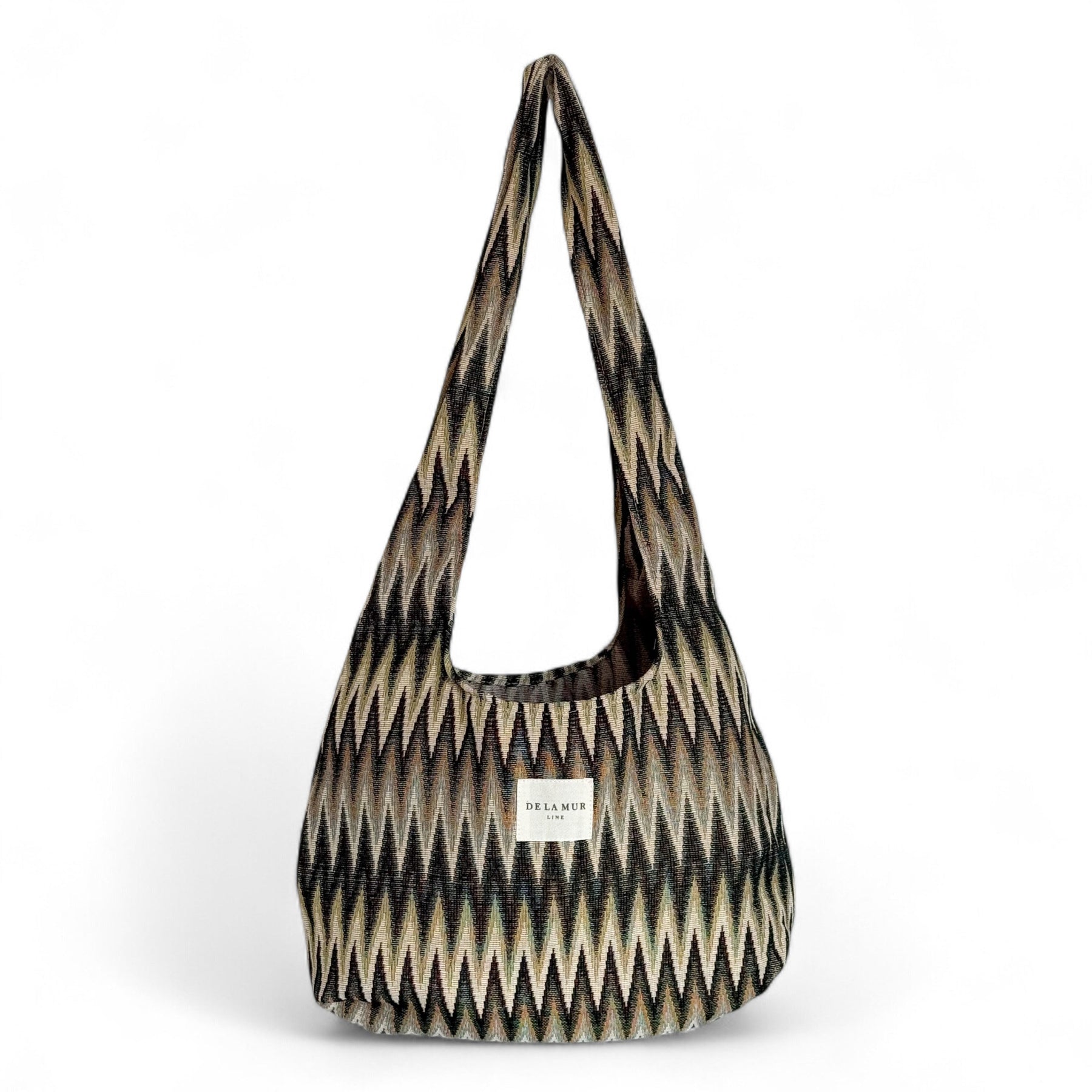Made from thick jacquard fabric with a zigzag pattern in beige and brown tones. For proper care, we recommend hand washing in cold water and avoiding the dryer.