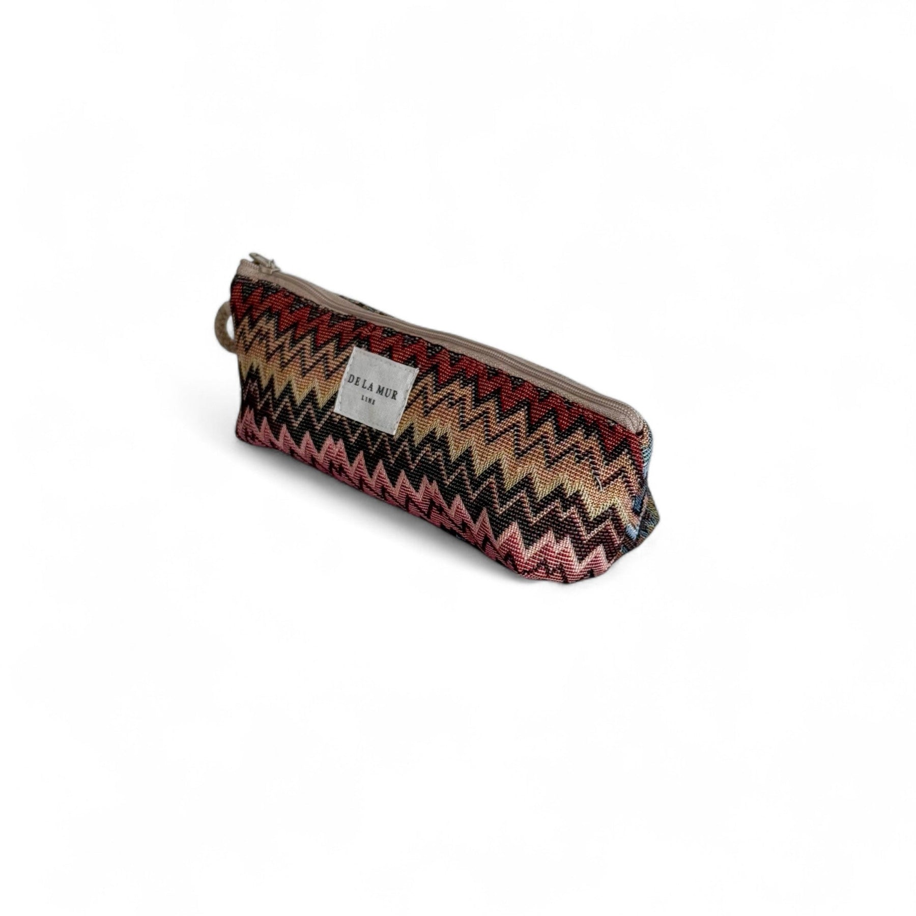 Made from thick jacquard fabric with a multicolor zigzag pattern. Each item may have slight variations in the pattern depending on where the fabric was cut. Lined inside with thick gray fabric. For proper care, hand wash in cold water and do not use a dryer.