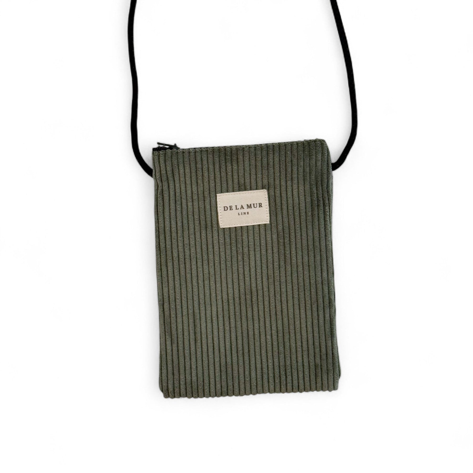 Crossbody-style phone bag. It features a zipper at the top and a long black cotton drawstring. Made with thick green corduroy fabric. Each item may have a variation in the print, depending on where the piece was cut. Lined with thick gray fabric on the inside. For proper care, we recommend hand washing in cold water and not using a dryer.