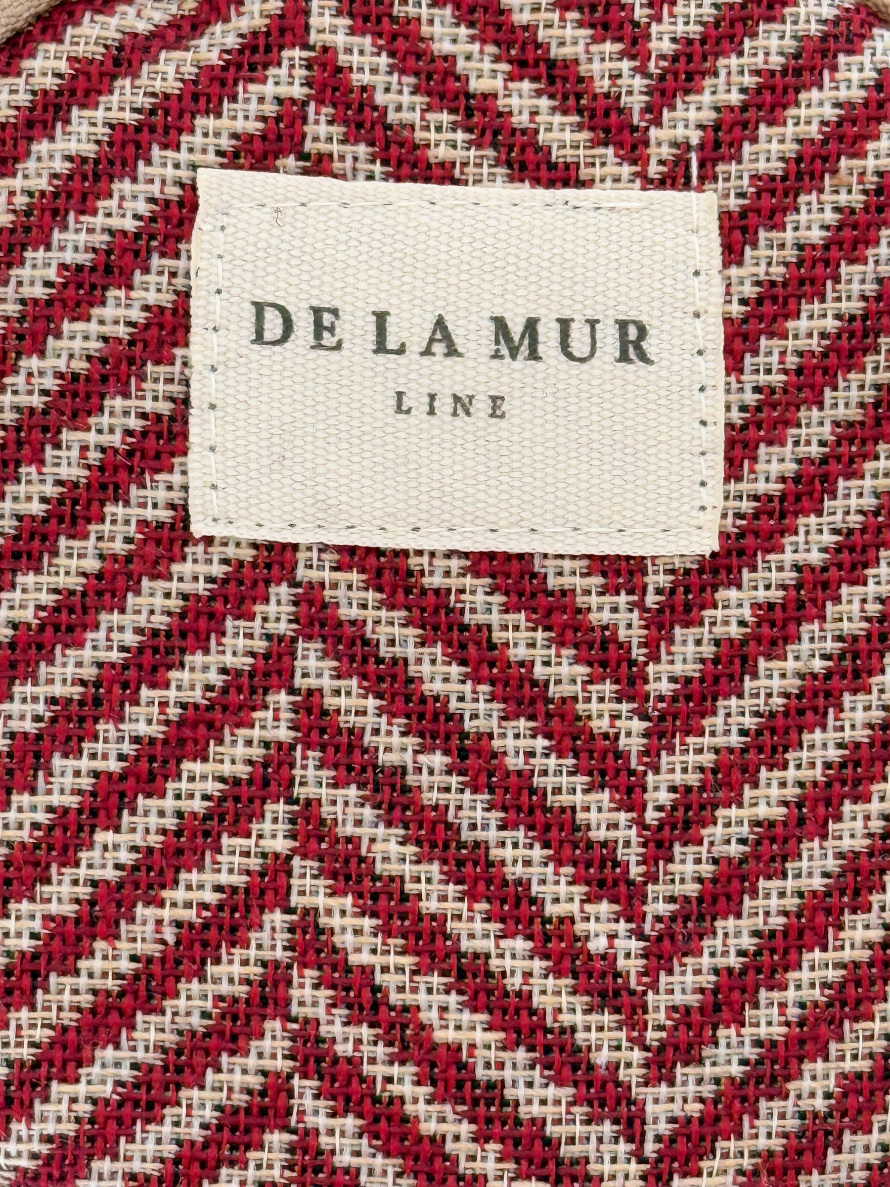 Round coin purse with zipper at the top and a small beige cord handle on the side. Made of thick jacquard fabric with a burgundy herringbone pattern. Each item may have variations in the pattern depending on where the piece was cut. Lined with thick gray fabric on the inside. For proper care, hand wash in cold water and do not use a dryer.
