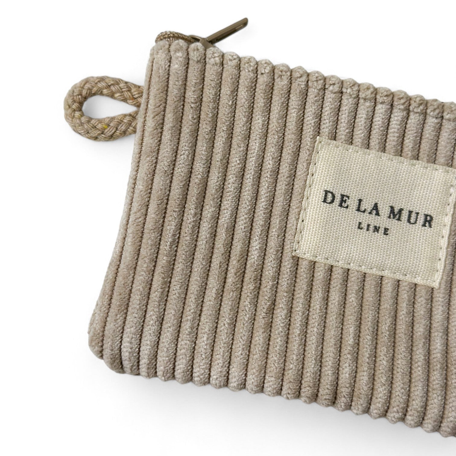 A purse with a zipper at the top and a small beige cord handle on the side. Made with thick beige corduroy fabric. Each item may have a variation in the print, depending on where the piece was cut. Lined with thick gray fabric on the inside. For proper care, we recommend hand washing in cold water and not using a dryer.