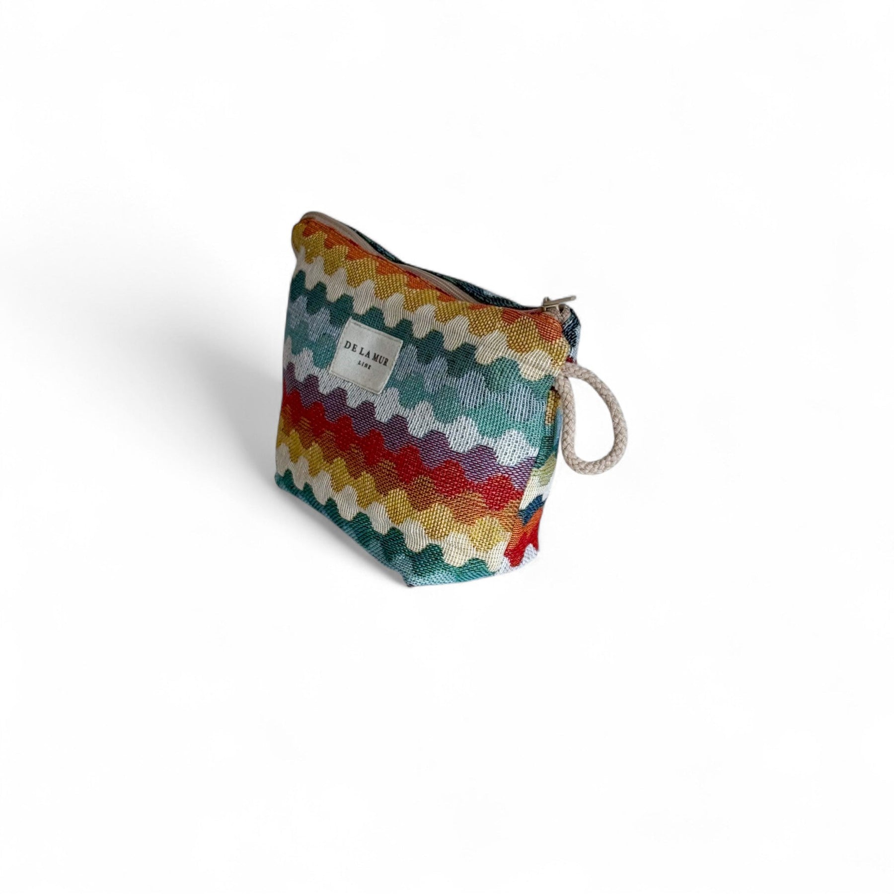 Small pouch with a zipper on top and a beige cord side handle. Made from thick jacquard fabric with a multicolor geometric pattern. Each item may have variations in the pattern depending on where the fabric was cut. For proper care, wash in cold water and do not tumble dry.