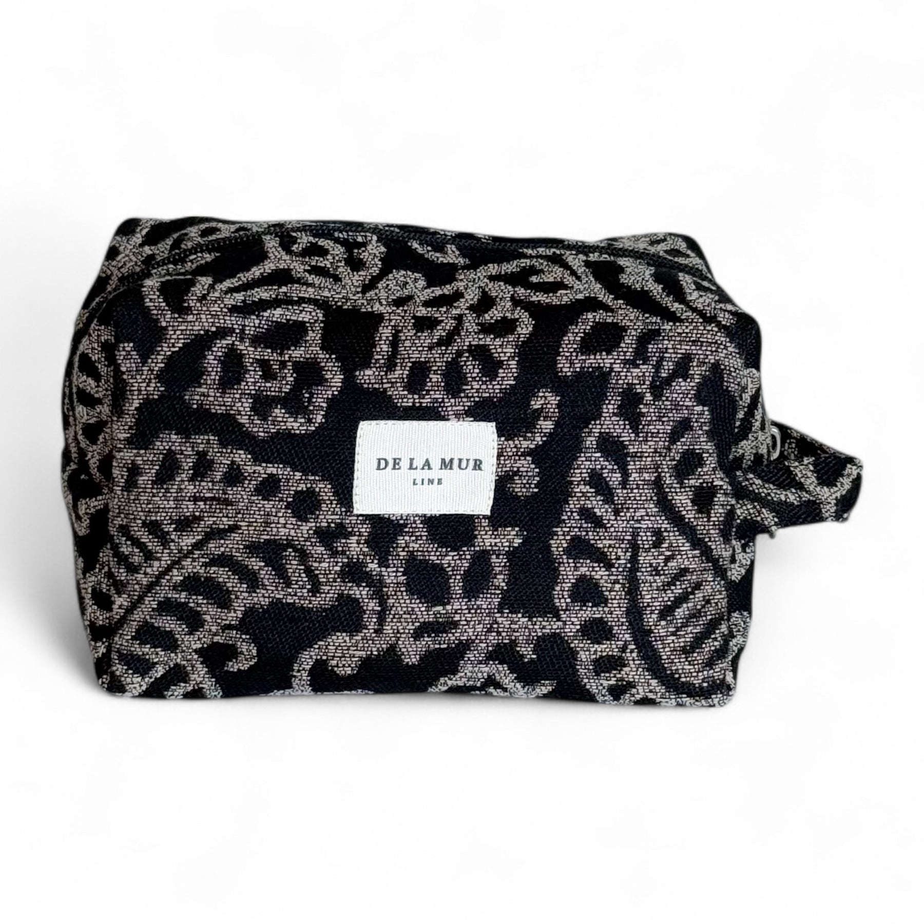 Medium-sized toiletry bag with a zipper at the top and a side handle. Made with thick jacquard fabric with a floral print in black and beige. For proper care, we recommend washing in cold water and not using a dryer.