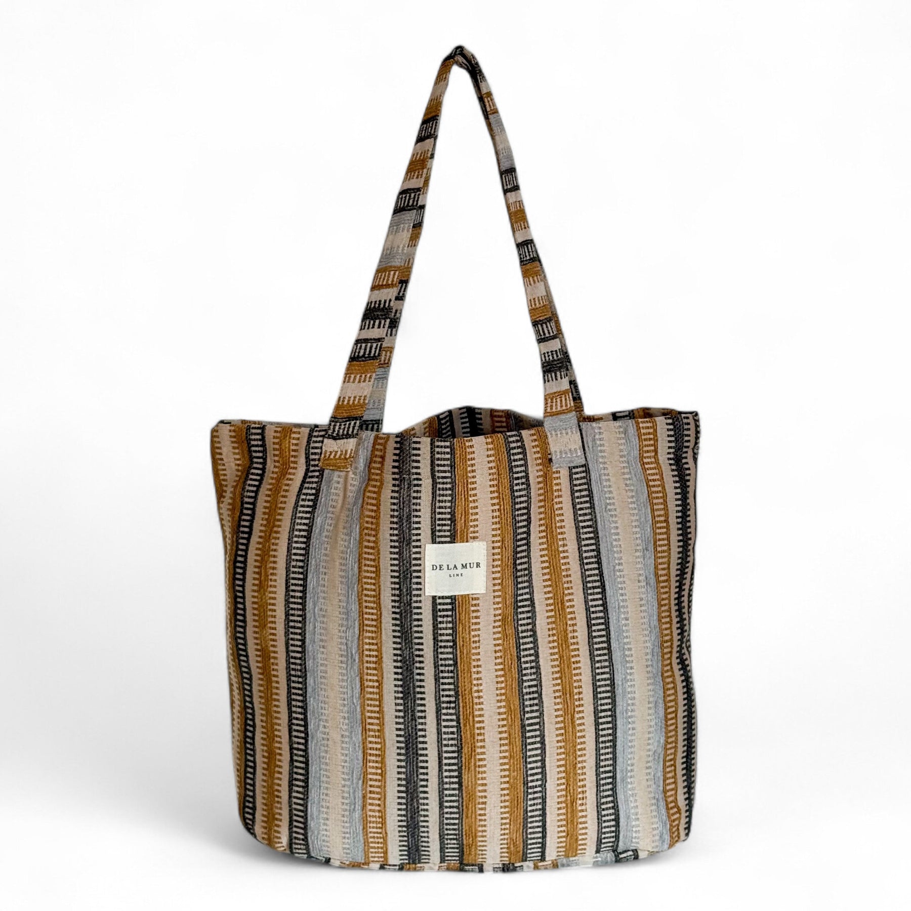 Large shopper bag with shoulder straps. Made with thick jacquard fabric with a striped print in shades of gray and mustard. For proper care, we recommend hand washing in cold water and not using a dryer.