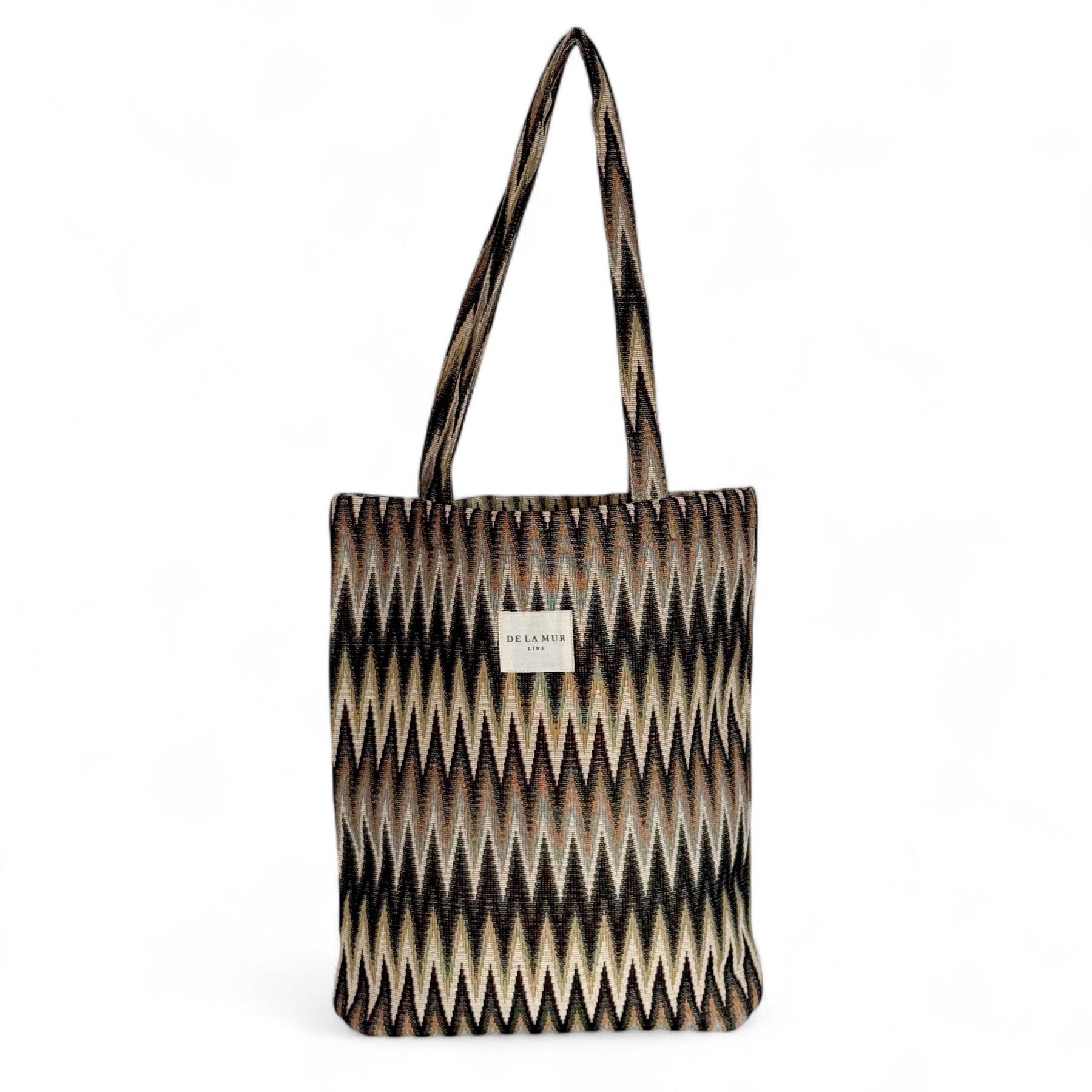 Tote bag with shoulder straps. Made with thick jacquard fabric with a geometric zigzag print in brown and beige tones. For proper care, we recommend washing in cold water and not using a dryer.