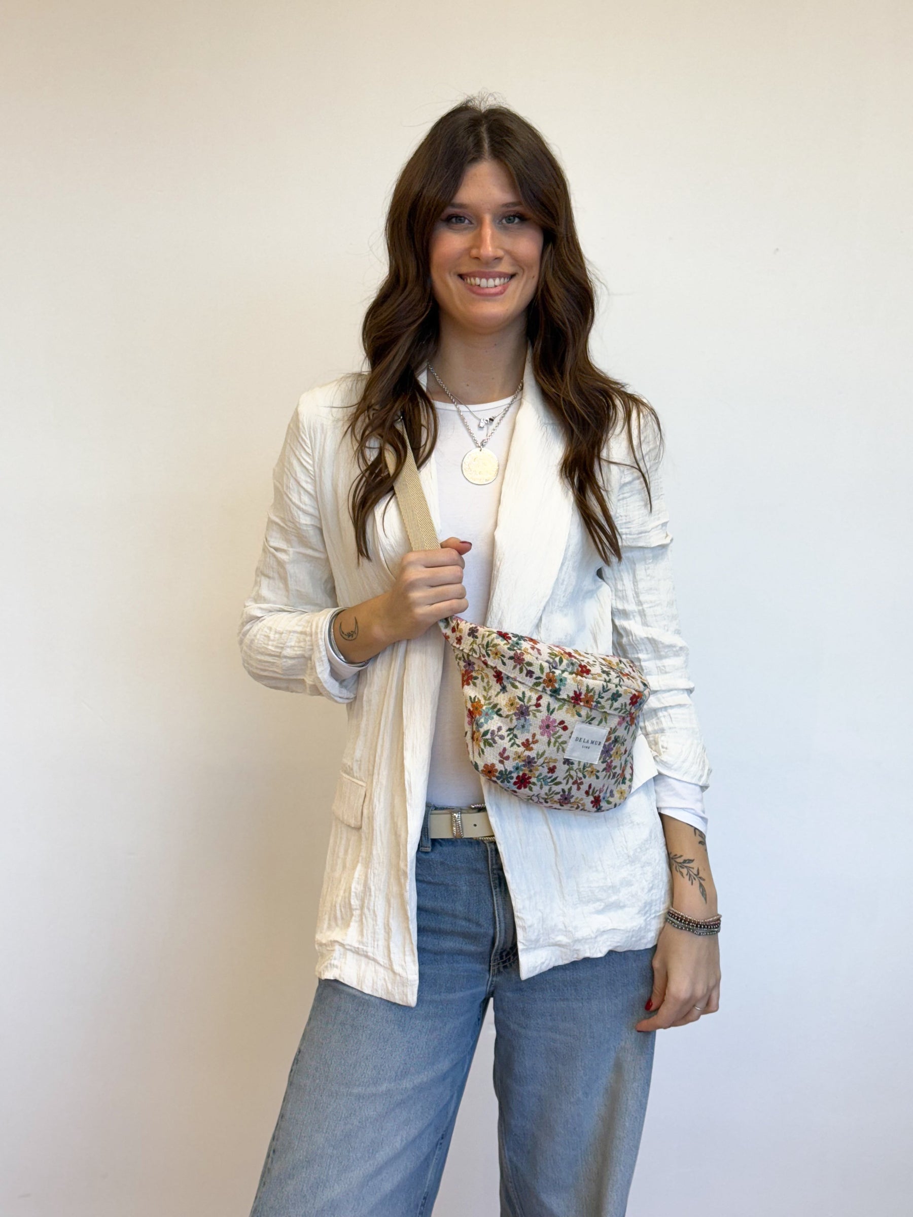 Fanny Pack with an adjustable long strap made of beige cotton webbing. Made from a thick jacquard fabric with a floral print on a beige background. Zipper closure at the top. Lined with a thick gray fabric inside. For proper maintenance, it is recommended to wash it by hand in cold water and not use a dryer.