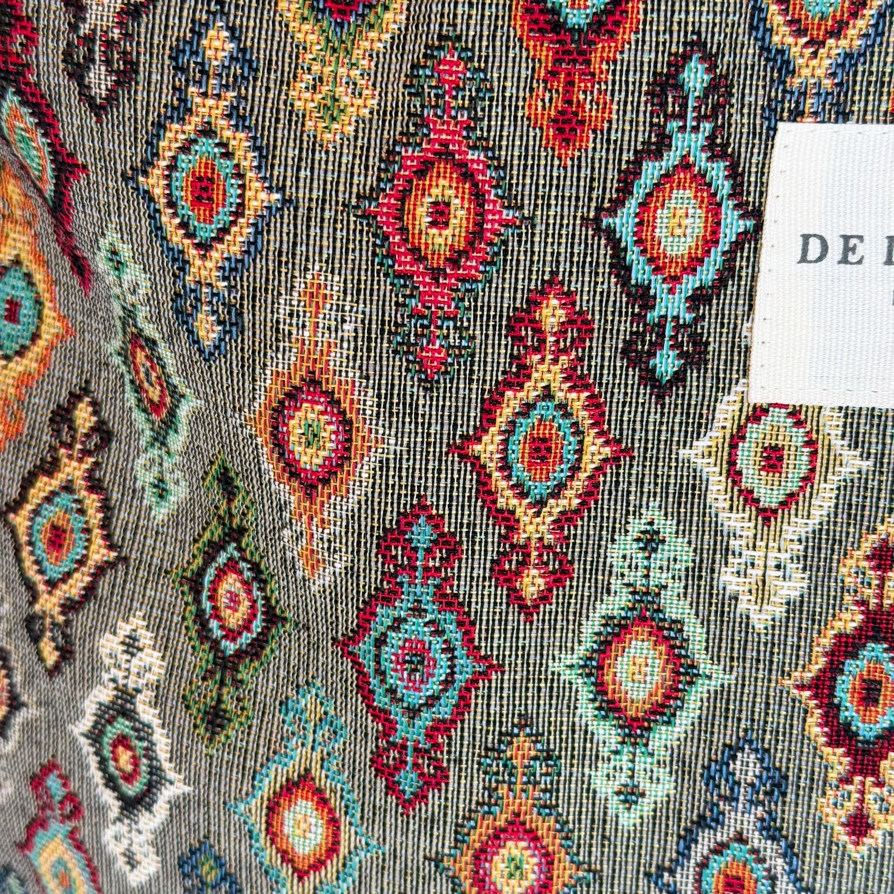 Medium bag with a zippered top and shoulder straps. Side pockets. Made with thick jacquard fabric with a multicolored geometric print on a gray background. For proper care, we recommend hand washing in cold water and not using a dryer.