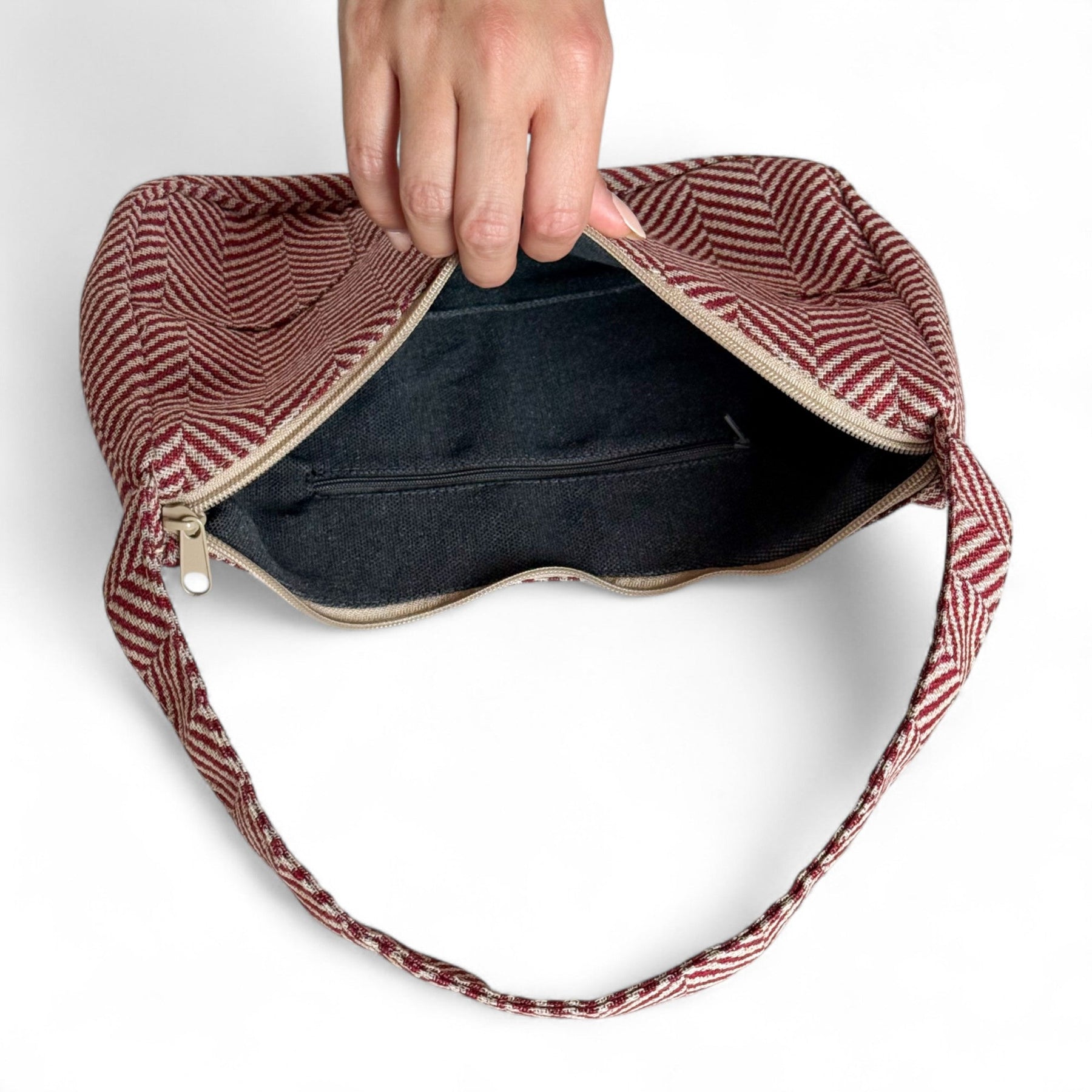 Bolso pequeño para llevar al hombro con asa de tejido. Cierre superior con cremallera. Con tejido grueso de jacquard con estampado de espiga de color granate. Forrado de tejido grueso de color gris en la parte interior. Bolsillo interior con cremallera. Para su correcto mantenimiento se aconseja lavarlo en frío a mano y no utilizar secadora.