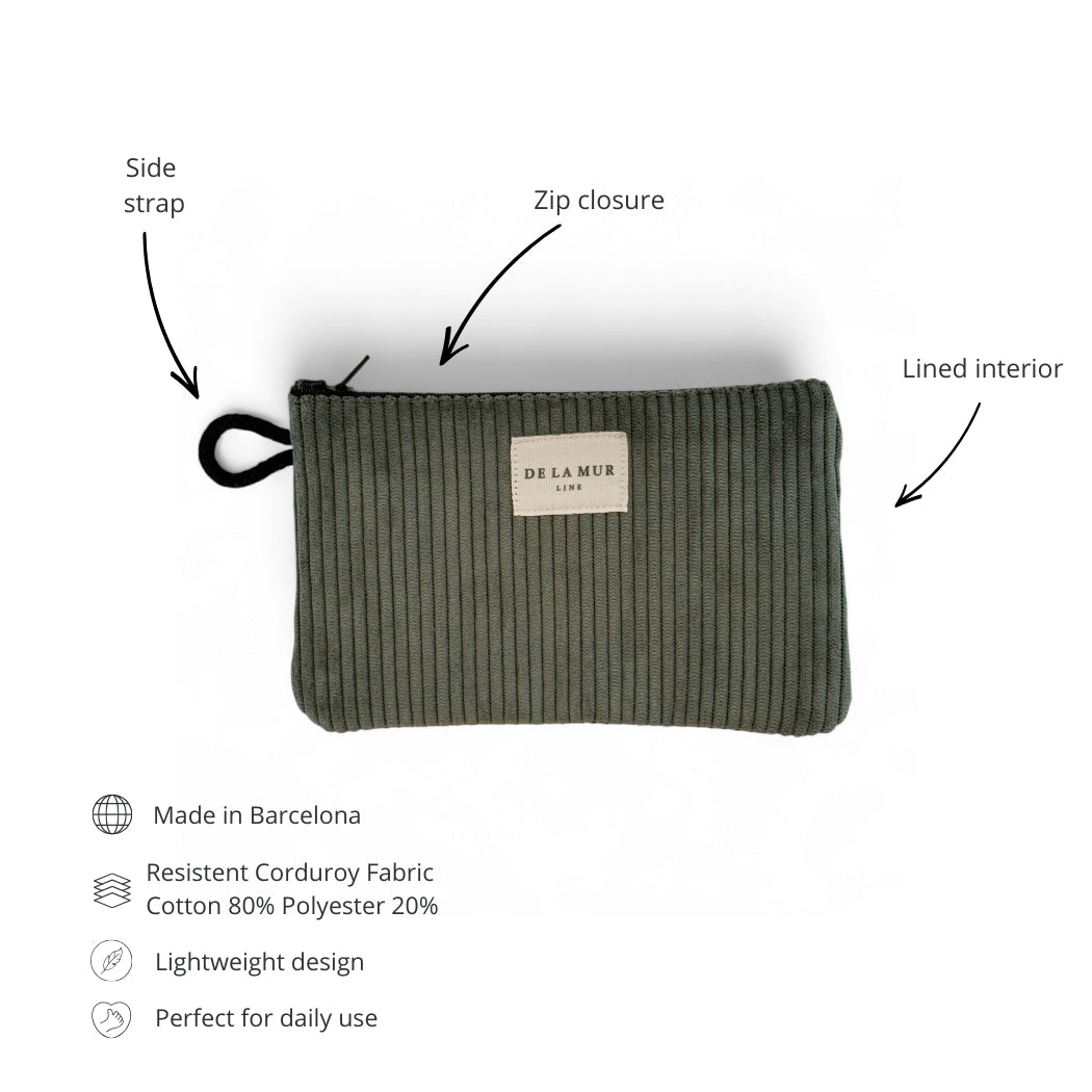 Small makeup bag / coin purse with zipper on the top and small black cord handle on the side. Made of thick green velvet fabric. Each item may have slight variations depending on where the fabric was cut. Lined with thick gray fabric on the inside. For proper care, hand wash in cold water and do not tumble dry.