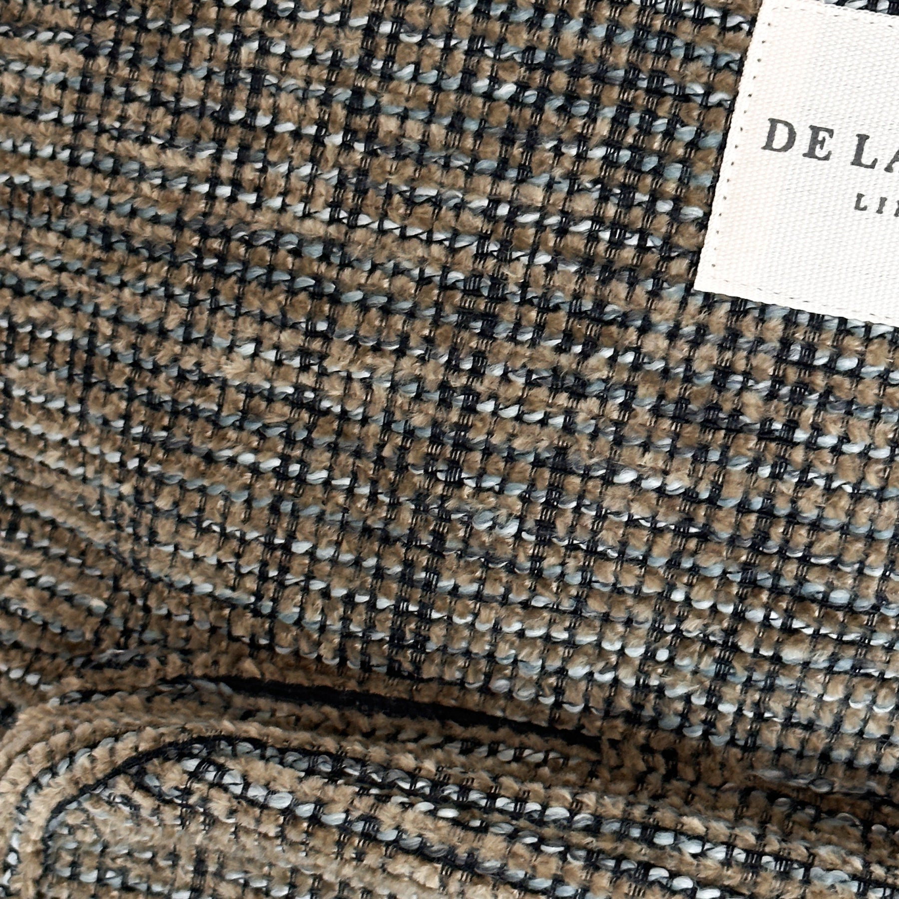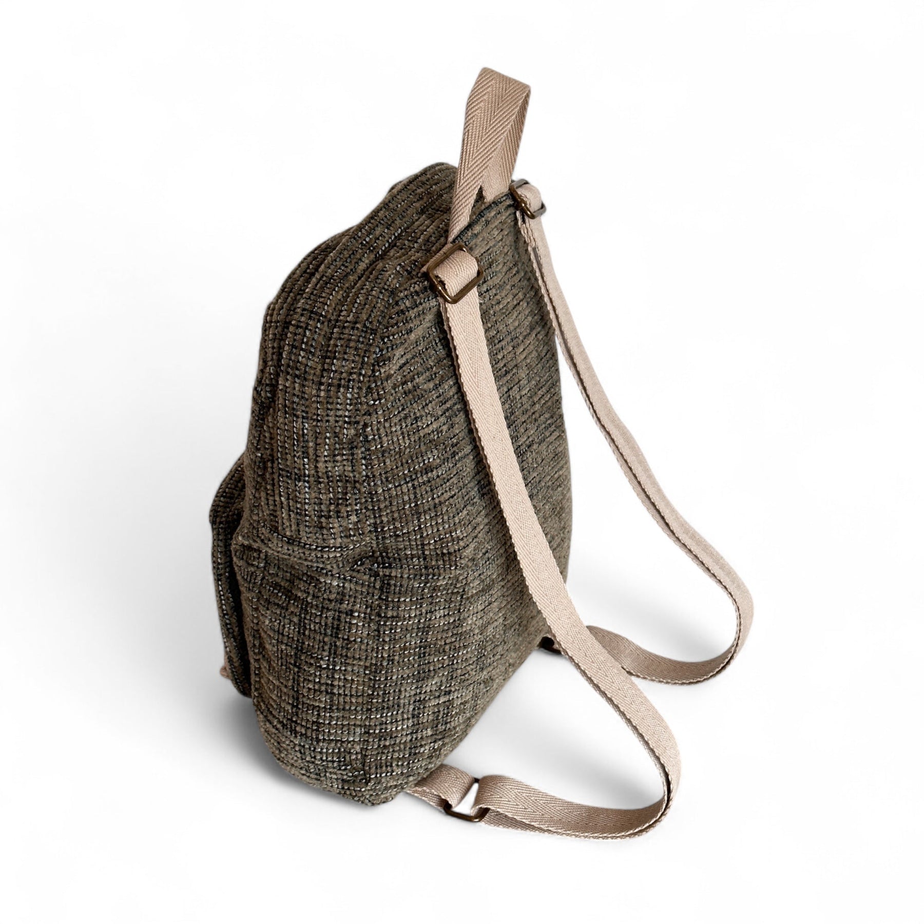 Backpack with adjustable straps and a front pocket. Made from thick khaki green upholstery fabric. Interior zip pocket. Khaki cotton herringbone tape handles with a broken stripe detail on the sides. For proper care, wash in cold water and do not tumble dry.