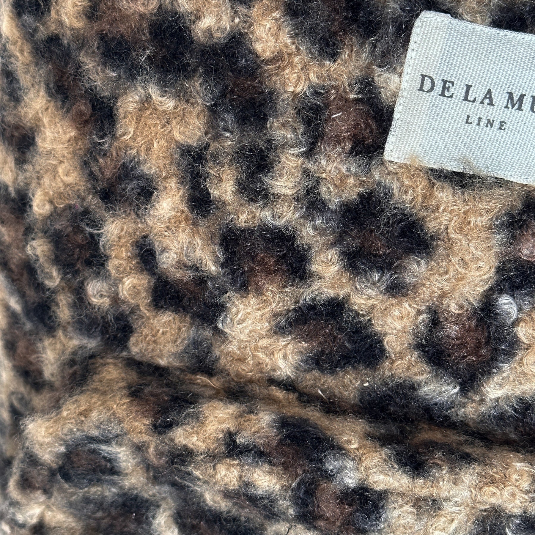 Backpack with adjustable straps and a front pocket. Made from thick sherpa fabric with a leopard print. Interior zip pocket. Beige cotton herringbone tape handles. For proper care, wash in cold water and do not tumble dry.