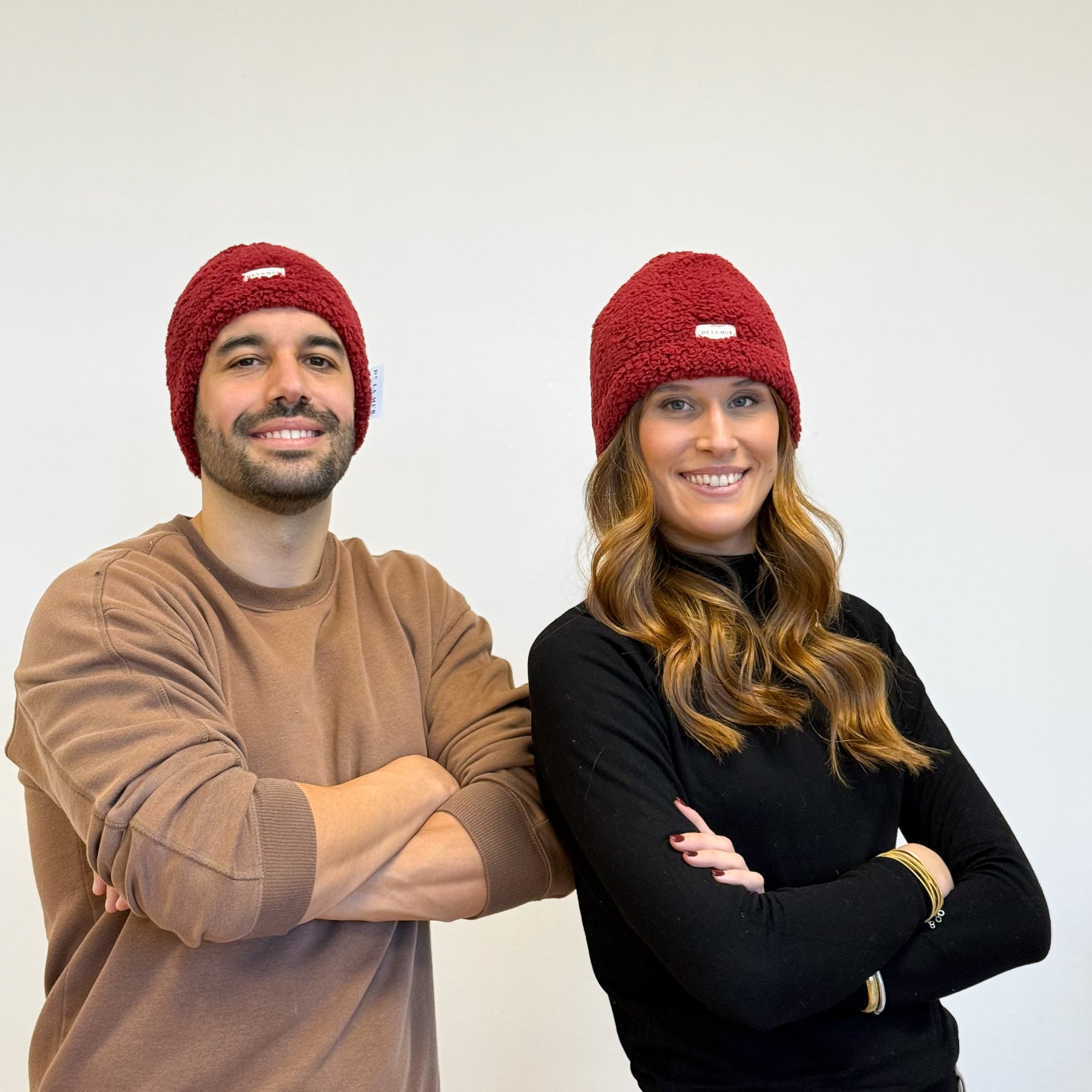 Beanie made of thick, soft, and warm sherpa fabric in burgundy. For proper care, wash in cold water and do not tumble dry.