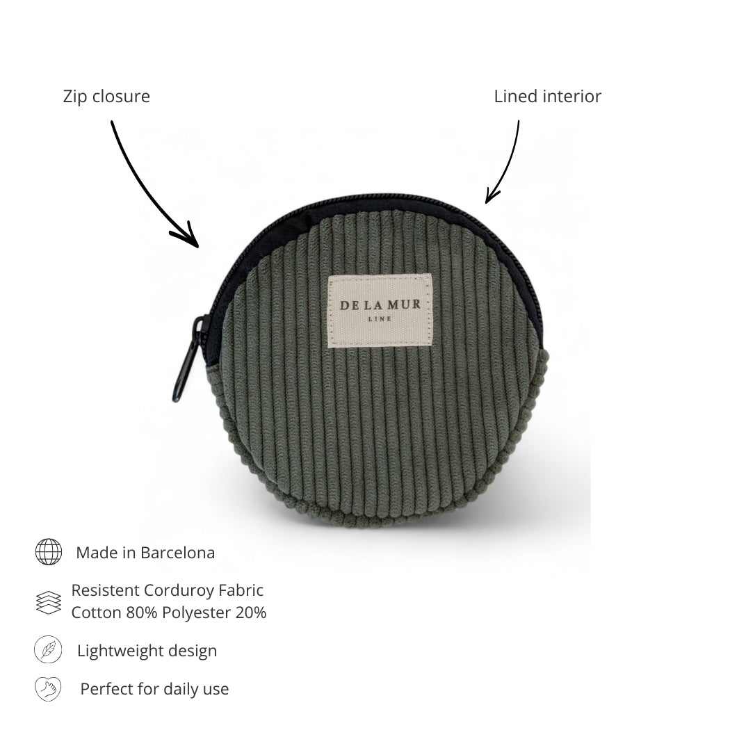 Round coin purse with zipper at the top and a small black cord handle on the side. Made of thick green velvet fabric. Each item may have variations in the pattern depending on where the piece was cut. Lined with thick gray fabric on the inside. For proper care, hand wash in cold water and do not use a dryer.