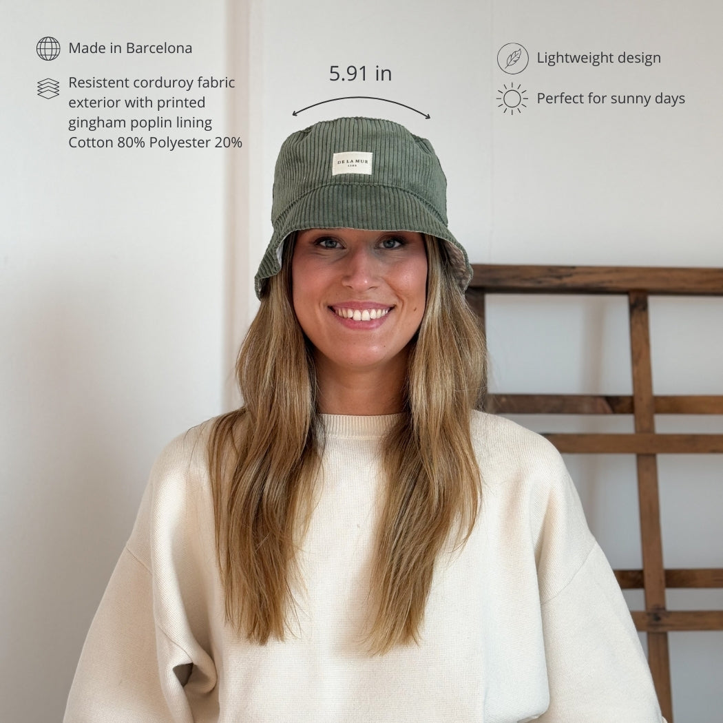 Gorro tipo "Bucket Hat" con tejido grueso de pana verde y forro de tela estampada en la parte interior. Reversible. Talla única. Para su correcto mantenimiento se aconseja lavarlo en frío y no utilizar secadora.