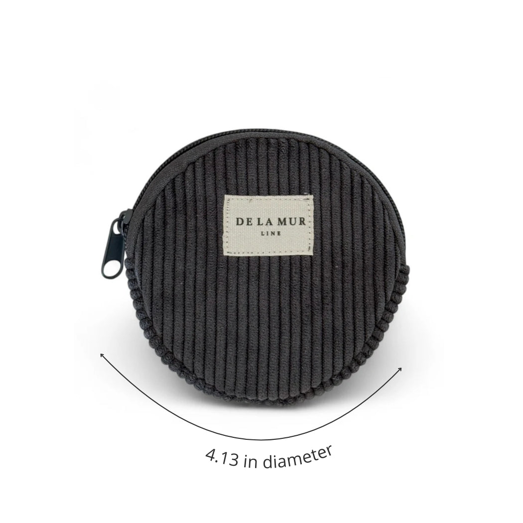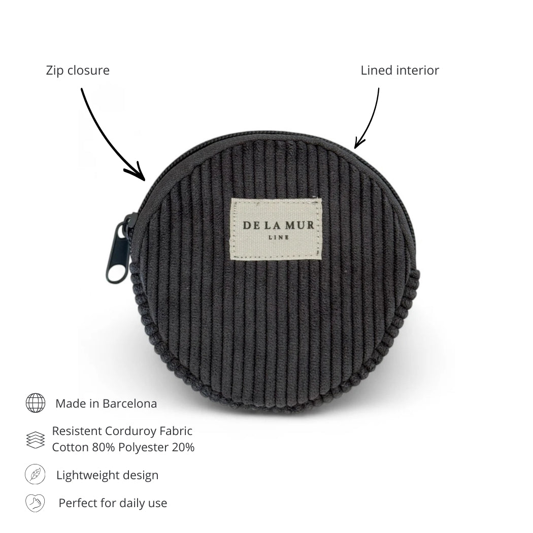 Monedero redondo con cremallera en la parte superior y pequeña asa de cordón de color gris oscuro en el lateral. Con tejido grueso de pana de color gris oscuro. Cada articulo puede tener una variación en el estampado, dependiendo de donde se haya efectuado el corte de la pieza. Forrado de tejido grueso de color gris en la parte interior. Para su correcto mantenimiento se aconseja lavarlo en frío a mano y no utilizar secadora.