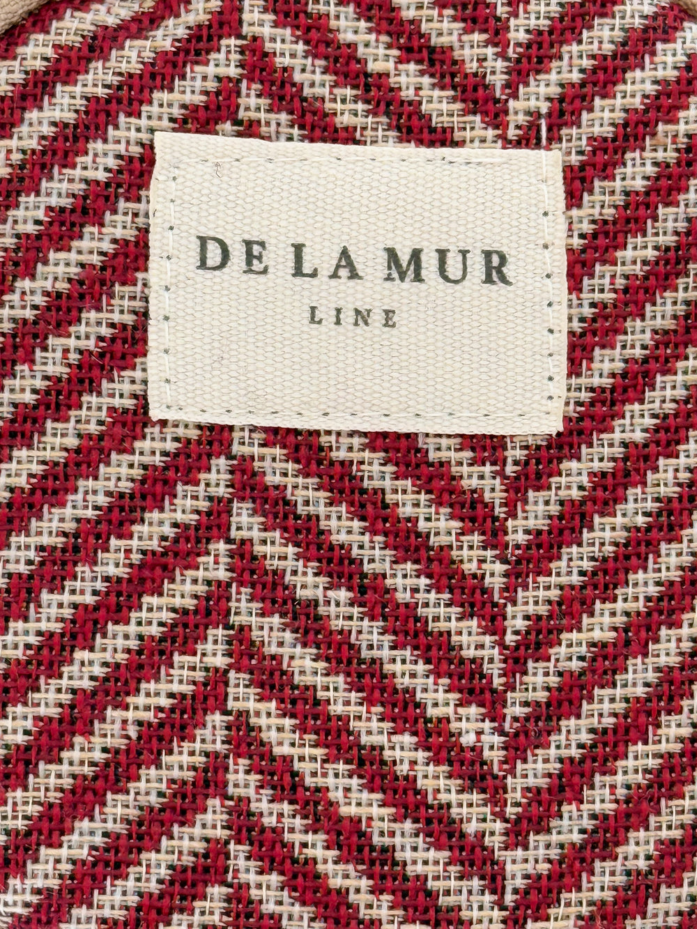 Monedero redondo con cremallera en la parte superior y pequeña asa de cordón de color beige en el lateral. Con tejido grueso de jacquard con estampado tipo espiga de color granate. Cada articulo puede tener una variación en el estampado, dependiendo de donde se haya efectuado el corte de la pieza. Forrado de tejido grueso de color gris en la parte interior. Para su correcto mantenimiento se aconseja lavarlo en frío a mano y no utilizar secadora.
