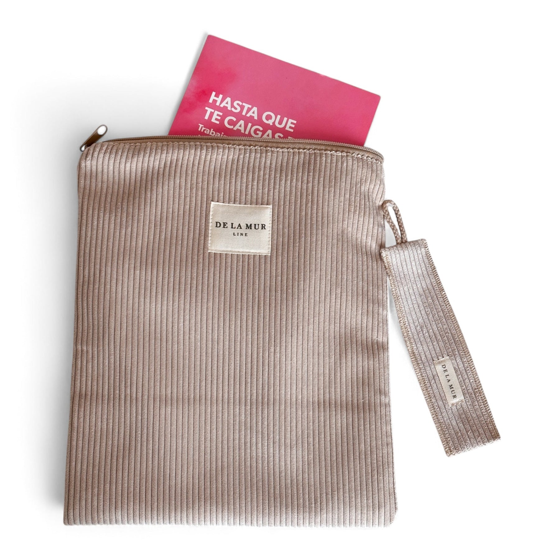 Funda de libro con cremallera con punto de libro a conjunto. Con un tejido grueso de pana de color beige. Forrado de tejido grueso de color gris en la parte interior. Para su correcto mantenimiento se aconseja lavarlo en frío a mano y no utilizar secadora.