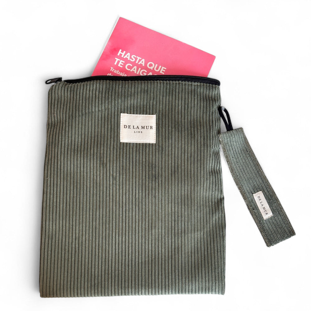 Funda de libro con cremallera con punto de libro a conjunto. Con un tejido grueso de pana de color verde. Forrado de tejido grueso de color gris en la parte interior. Para su correcto mantenimiento se aconseja lavarlo en frío a mano y no utilizar secadora.