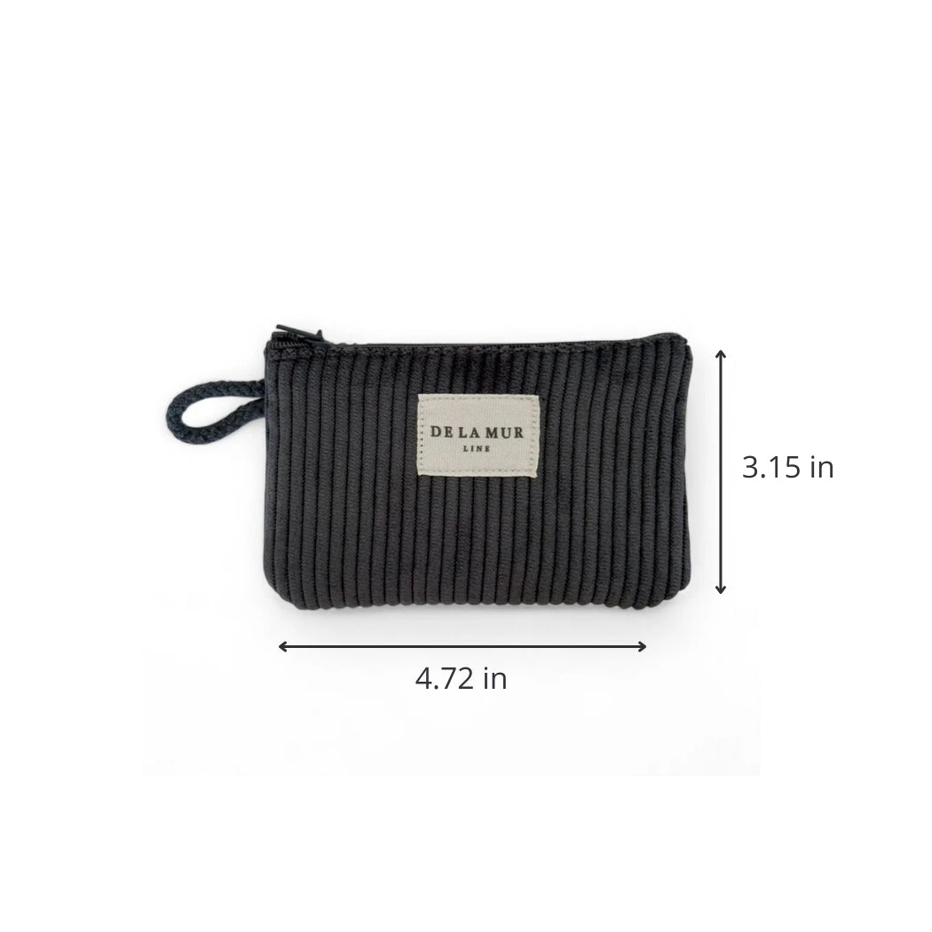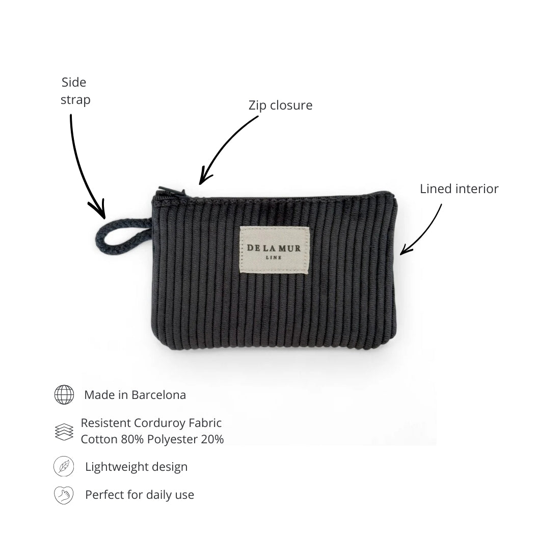 Monedero con cremallera en la parte superior y pequeña asa de cordón de color gris oscuro en el lateral. Con tejido grueso de pana de color gris oscuro. Cada articulo puede tener una variación en el estampado, dependiendo de donde se haya efectuado el corte de la pieza. Forrado de tejido grueso de color gris en la parte interior. Para su correcto mantenimiento se aconseja lavarlo en frío a mano y no utilizar secadora.