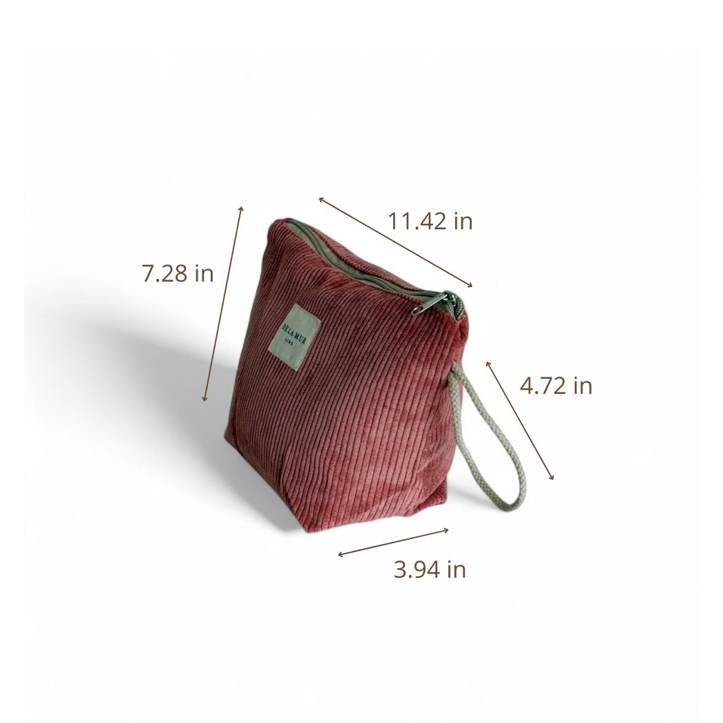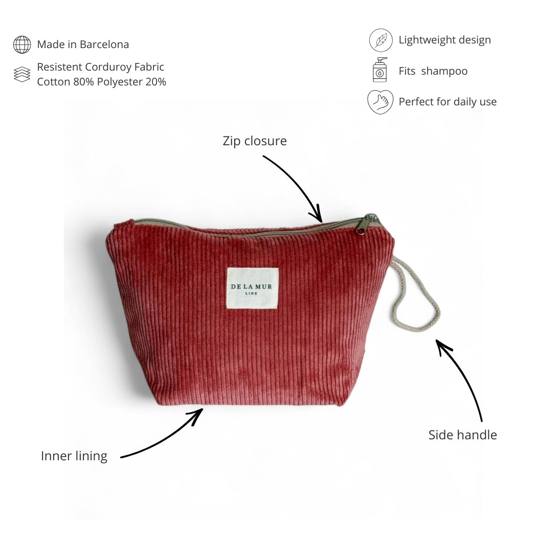 Neceser pequeño con cremallera en la parte superior y con asa lateral de cordón de color beige. Con tejido grueso de pana de color coral. Cada articulo puede tener una variación en el estampado, dependiendo de donde se haya efectuado el corte de la pieza. Para su correcto mantenimiento se aconseja lavarlo en frío y no utilizar secadora.