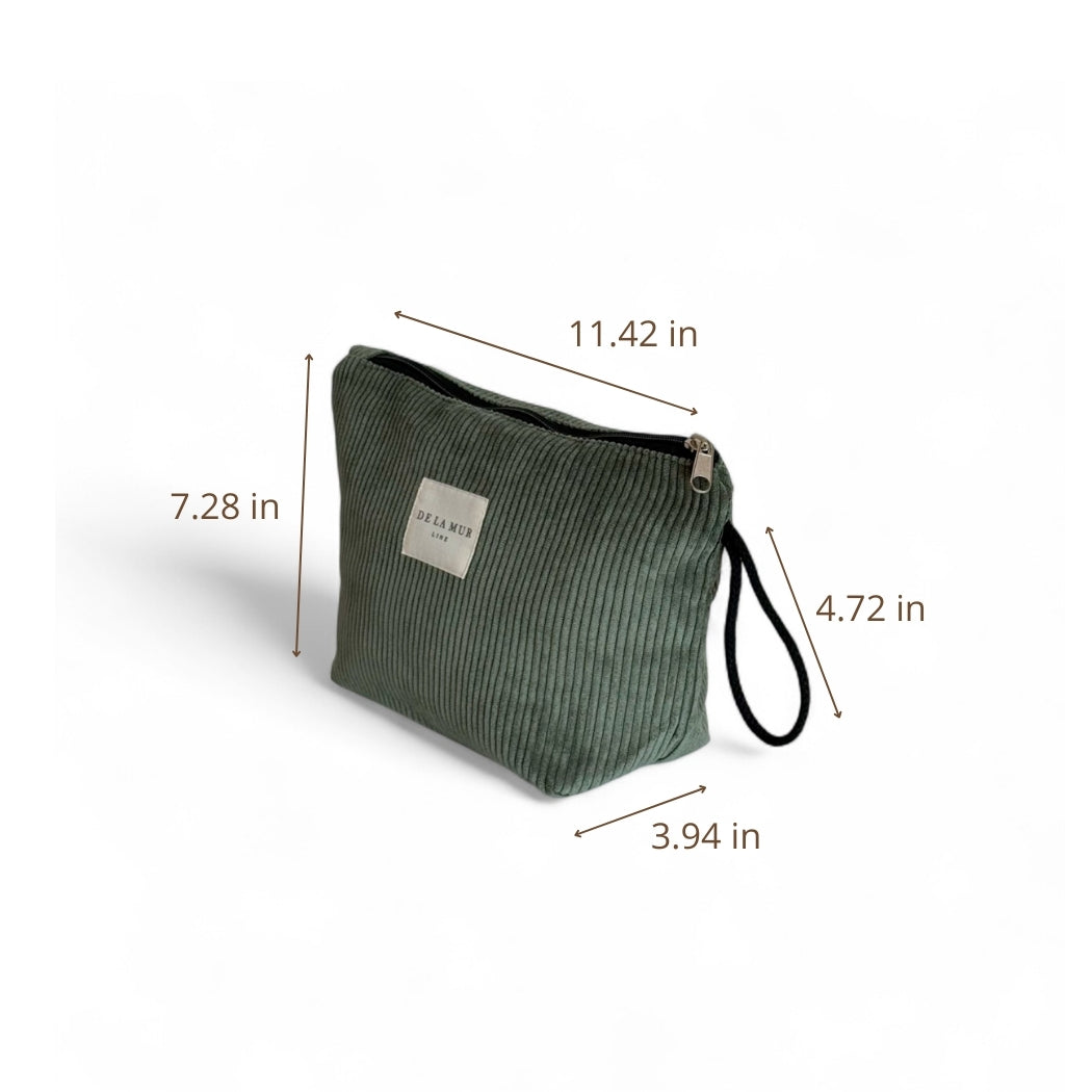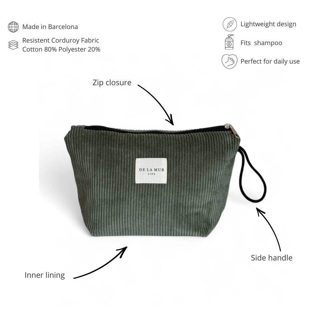 Neceser pequeño con cremallera en la parte superior y con asa lateral de cordón de color beige. Con tejido grueso de pana de color verde. Cada articulo puede tener una variación en el estampado, dependiendo de donde se haya efectuado el corte de la pieza. Para su correcto mantenimiento se aconseja lavarlo en frío y no utilizar secadora.