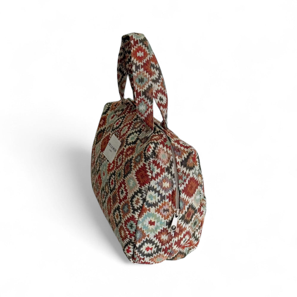 Trousse de toilette extra-large avec fermeture éclair et poignées en tissu. Confectionnée en tissu jacquard épais à imprimé géométrique multicolore, elle est doublée d'un épais tissu gris. Pour un entretien optimal, nous recommandons un lavage à la main à l'eau froide et l'utilisation d'un sèche-linge.