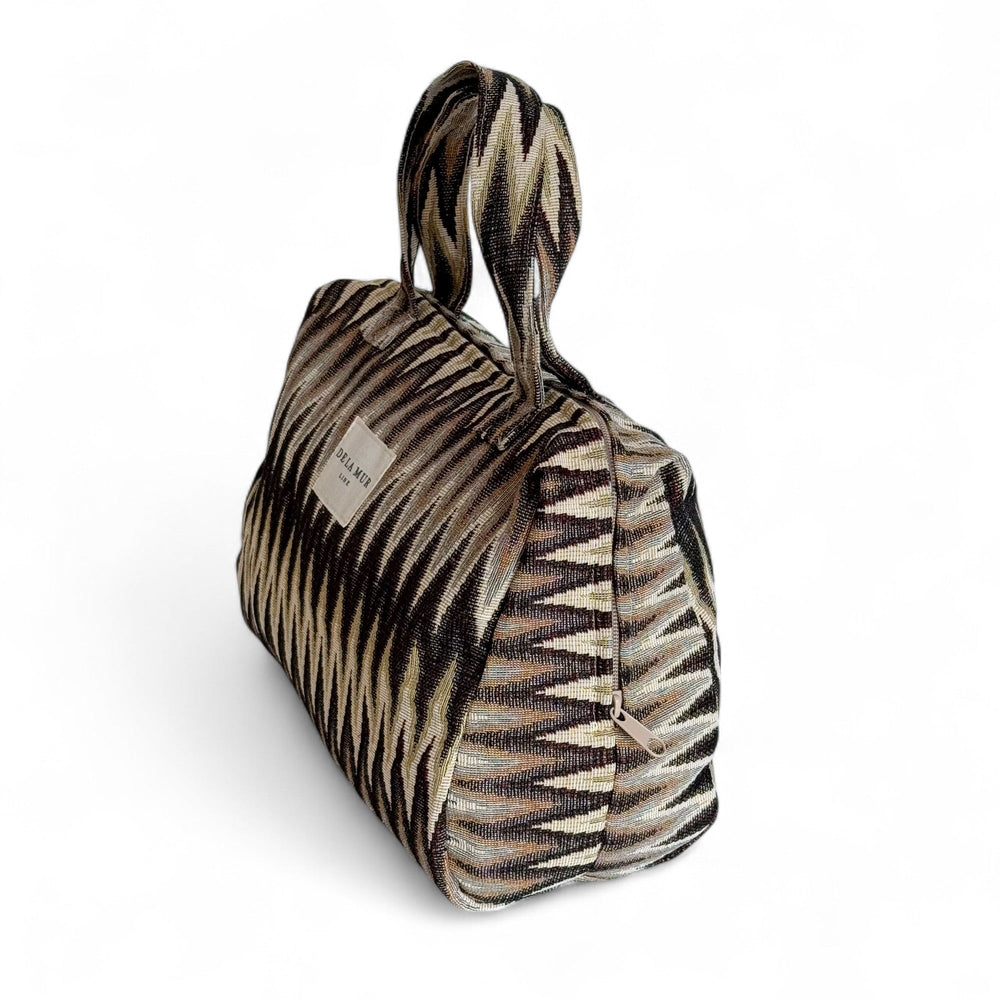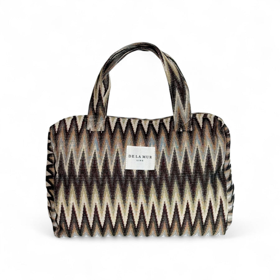 Trousse de toilette extra-large avec fermeture éclair et poignées en tissu. Confectionnée en tissu jacquard épais à motif zigzag noir, beige et marron. Doublée d'un épais tissu gris à l'intérieur. Pour un entretien optimal, nous recommandons un lavage à la main à l'eau froide et l'utilisation d'un sèche-linge.