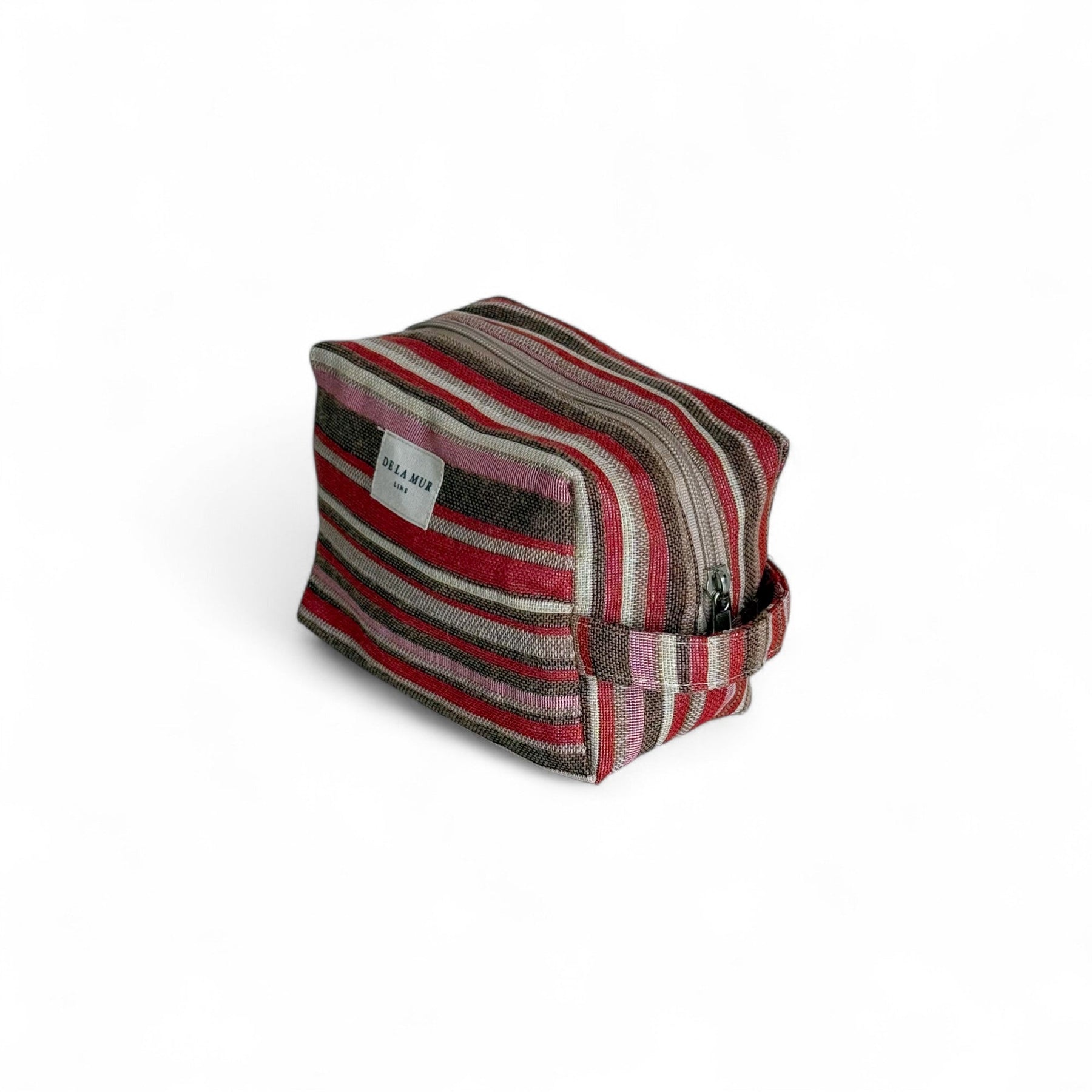 Trousse de toilette de taille moyenne avec fermeture éclair sur le dessus et poignée latérale. Confectionnée en tissu jacquard épais à rayures multicolores, elle est idéale pour un entretien optimal. Lavage à froid et séchage à l'air libre.