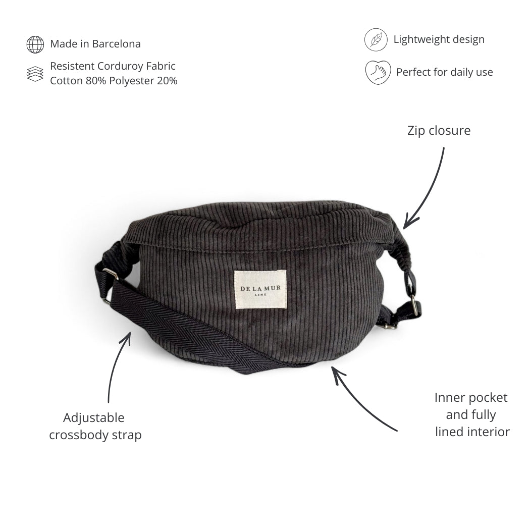 Sac banane à bandoulière avec longue bandoulière réglable en toile de coton gris chiné à chevrons. Tissu épais gris foncé. Fermeture zippée. Poche intérieure. Doublure en tissu gris épais. Pour un entretien optimal, laver à la main à froid et ne pas sécher en machine.