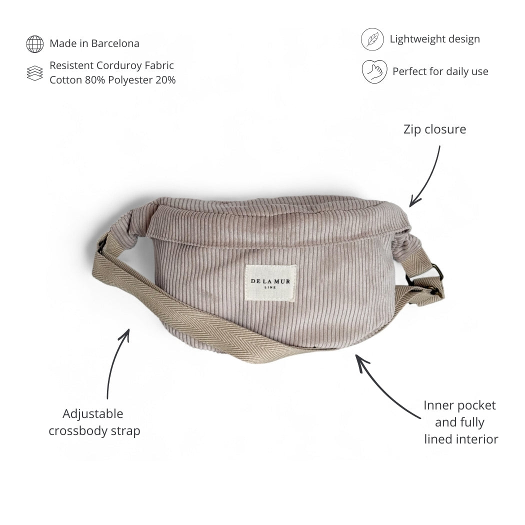 Sac banane à bandoulière avec longue bandoulière réglable en toile de coton beige à chevrons. Velours côtelé beige épais. Fermeture zippée sur le dessus. Poche intérieure. Doublure en tissu gris épais. Pour un entretien optimal, laver à la main à froid et ne pas sécher en machine.