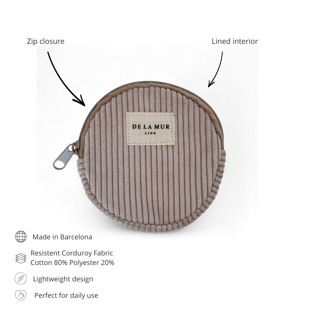Sac à main rond avec fermeture éclair sur le dessus et petite anse en cordon beige sur le côté. Fabriqué en velours côtelé beige épais. L'imprimé peut varier selon la coupe. Doublé d'un épais tissu gris à l'intérieur. Pour un entretien optimal, nous recommandons un lavage à la main à l'eau froide et l'utilisation d'un sèche-linge.