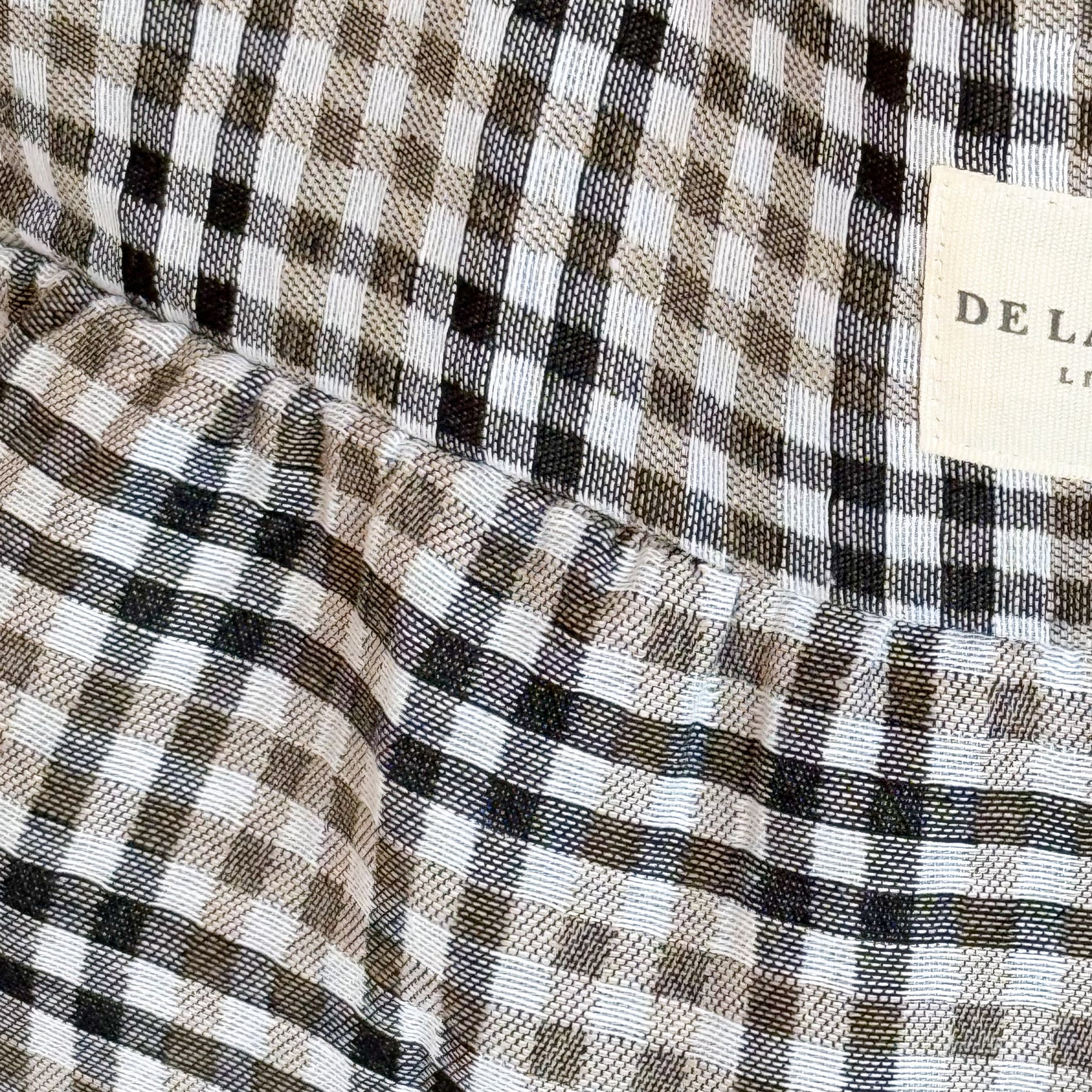 Sac à volants de taille moyenne. Confectionné en tissu jacquard épais à carreaux noirs et beiges. Pour un entretien optimal, nous recommandons un lavage à la main à l'eau froide et l'utilisation d'un sèche-linge.
