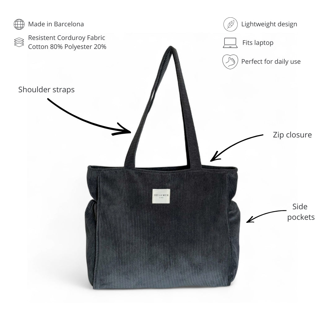 Sac de taille moyenne avec fermeture éclair sur le dessus et bretelles. Poches latérales. Fabriqué en velours côtelé épais gris foncé. Pour un entretien optimal, nous recommandons un lavage à la main à l'eau froide et l'utilisation d'un sèche-linge.