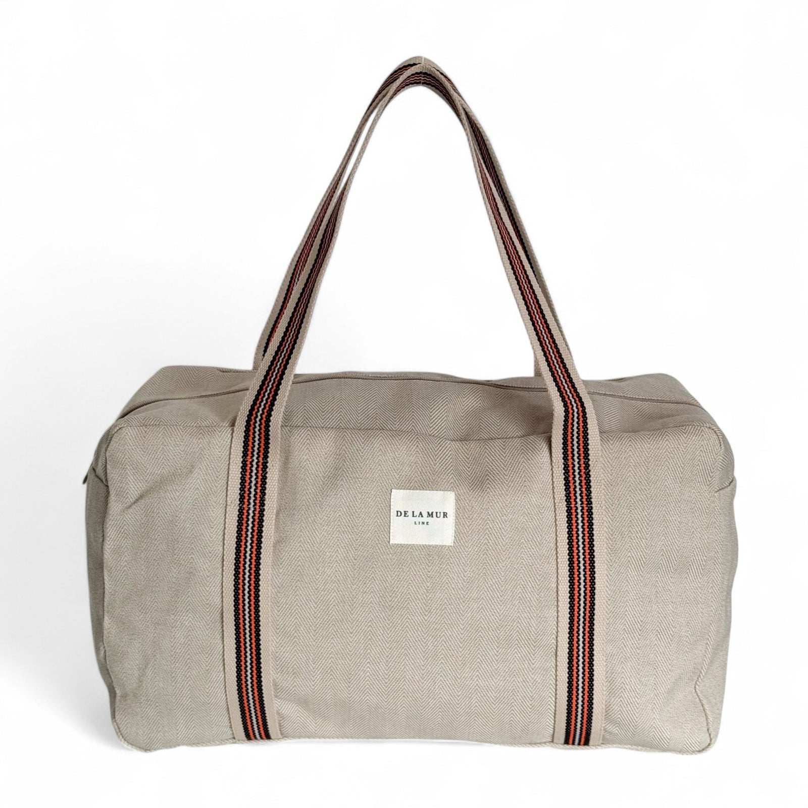 Sac de sport avec anses supérieures de taille moyenne, en toile de coton beige avec une bande centrale marron et orange. Confectionné en tissu beige uni épais à chevrons, il possède une fermeture éclair grise sur le dessus et une poche intérieure zippée. Doublé en tissu gris épais. Pour un entretien optimal, nous recommandons un lavage à la main à l'eau froide et l'utilisation d'un sèche-linge.