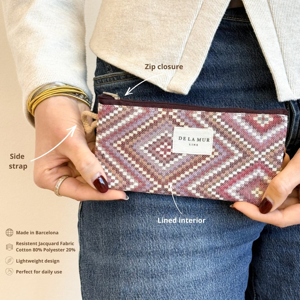 Jacquard eyewear case with a top zipper and small beige cord handle. Made from thick 80% cotton, 20% polyester fabric with a geometric pattern in pink and lilac tones. Lined with thick gray fabric. Protects your glasses in style and fits most standard eyewear. Made in Spain using locally sourced fabrics.