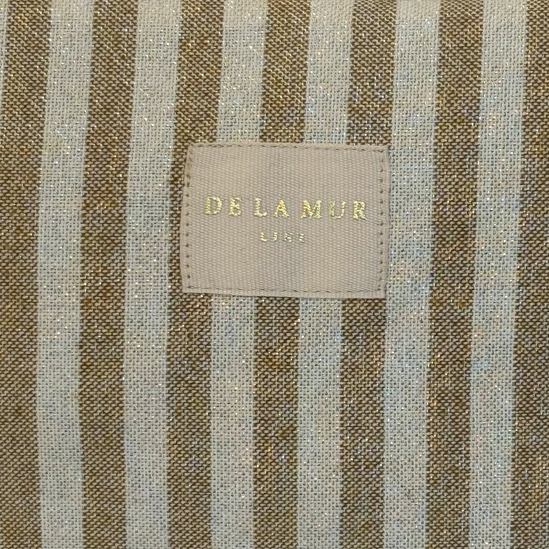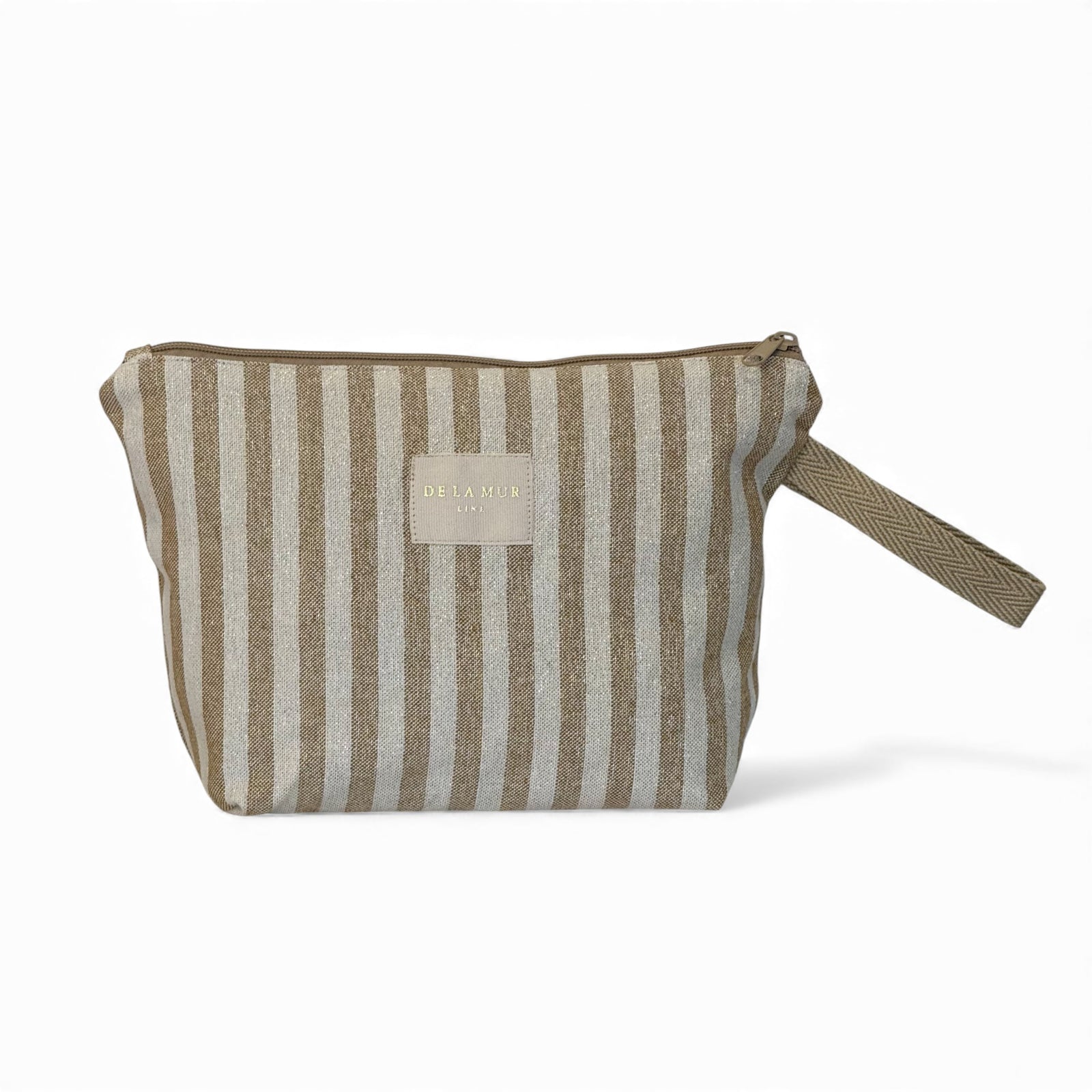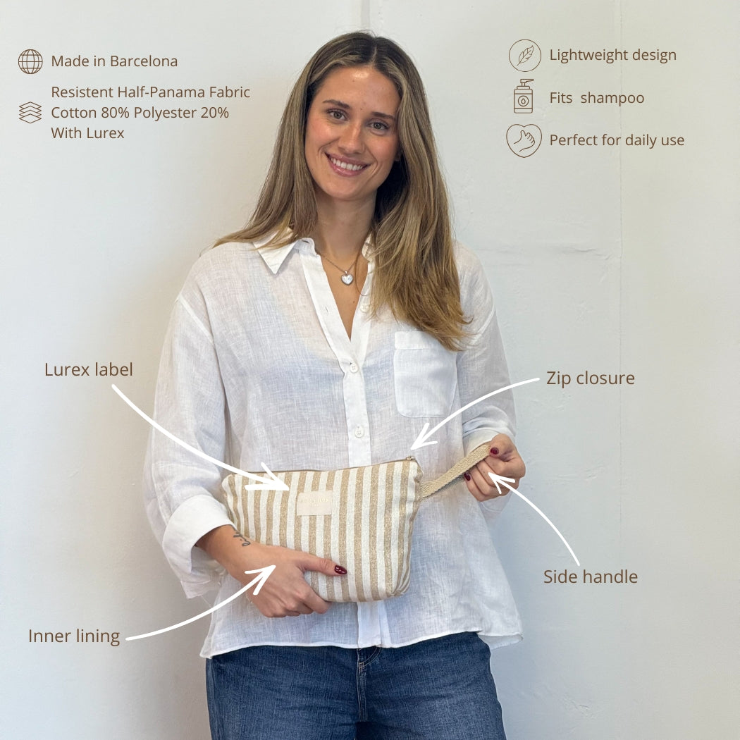 Large striped toiletry pouch with top zipper and beige cord handle. Lightweight yet durable, fully lined, and accented with subtle gold Lurex threads for a touch of sparkle. Perfect for travel, beach trips, or everyday use—keeps all your essentials organized in style.