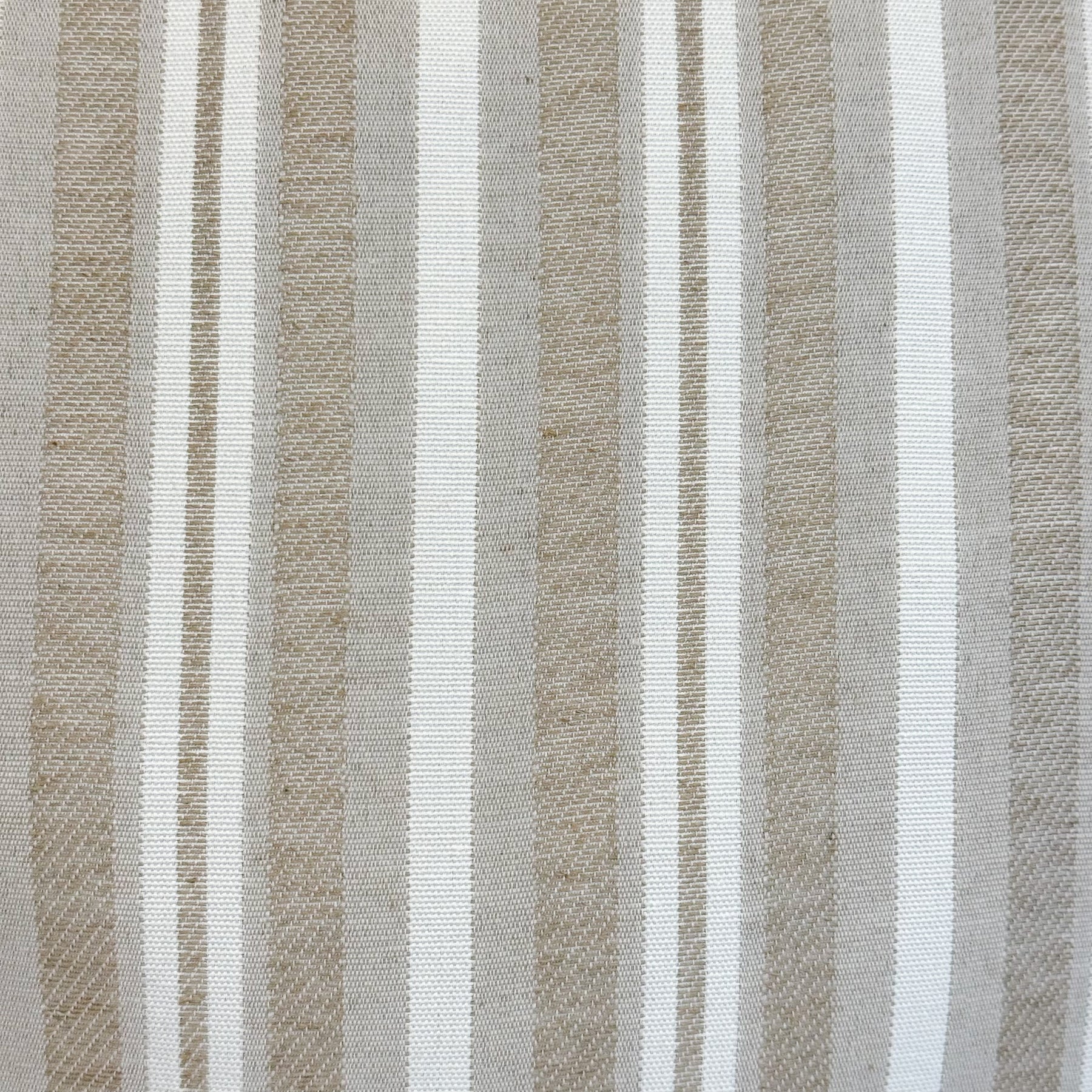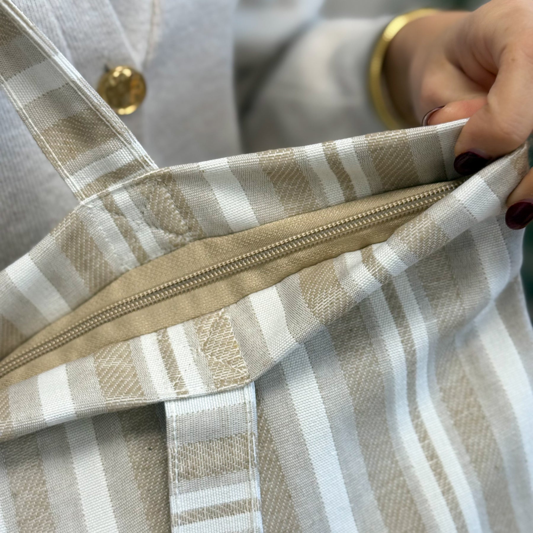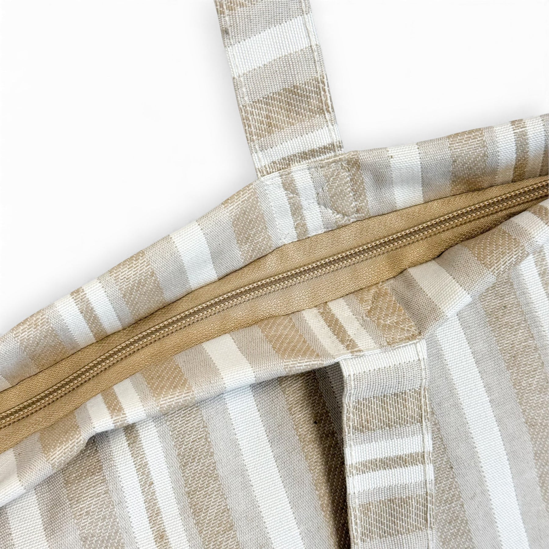 Large zippered tote bag with shoulder straps. Made from jacquard fabric (80% cotton, 20% polyester) featuring a striped pattern in beige and off-white tones. Includes a top zipper closure. For proper care, we recommend hand washing in cold water and not tumble drying.