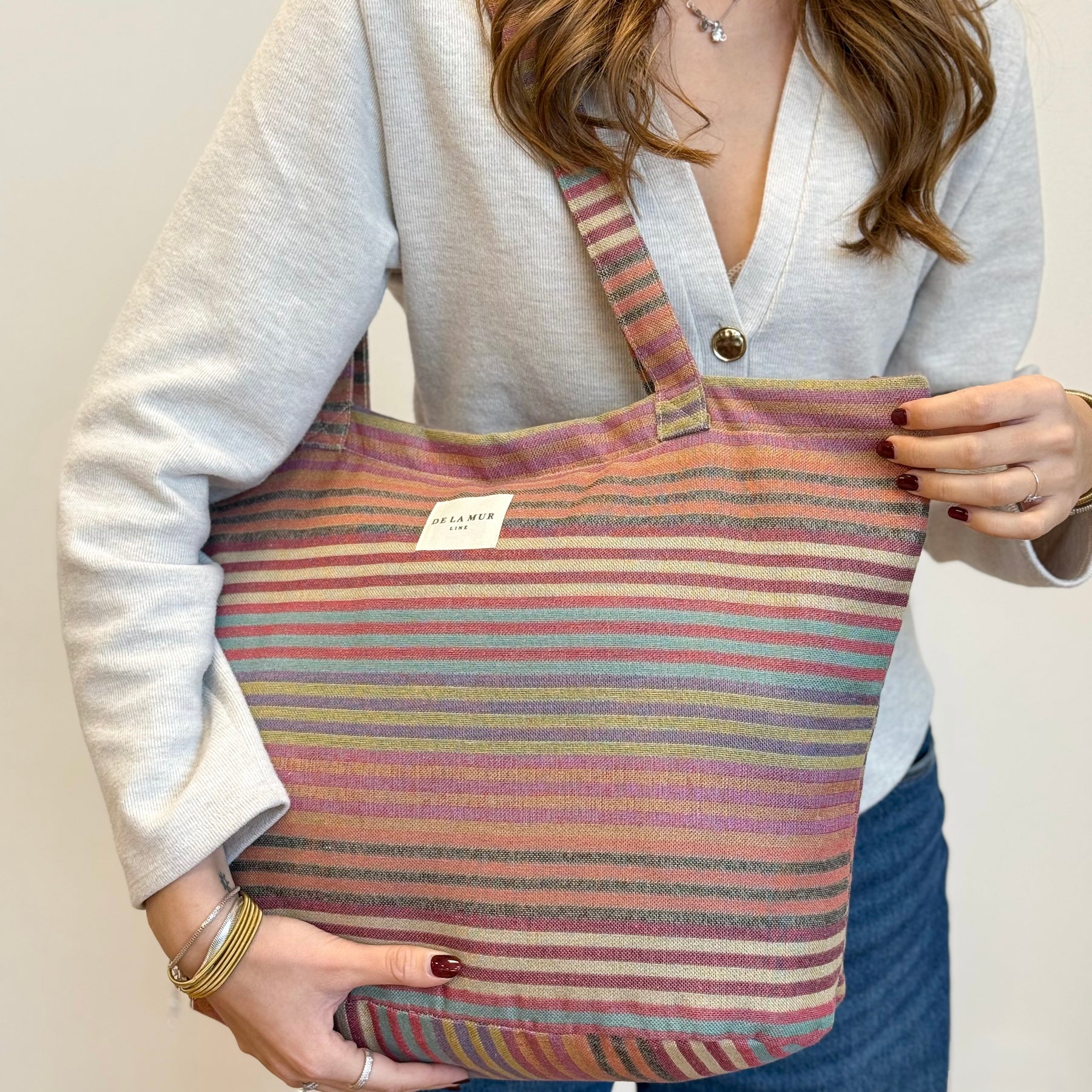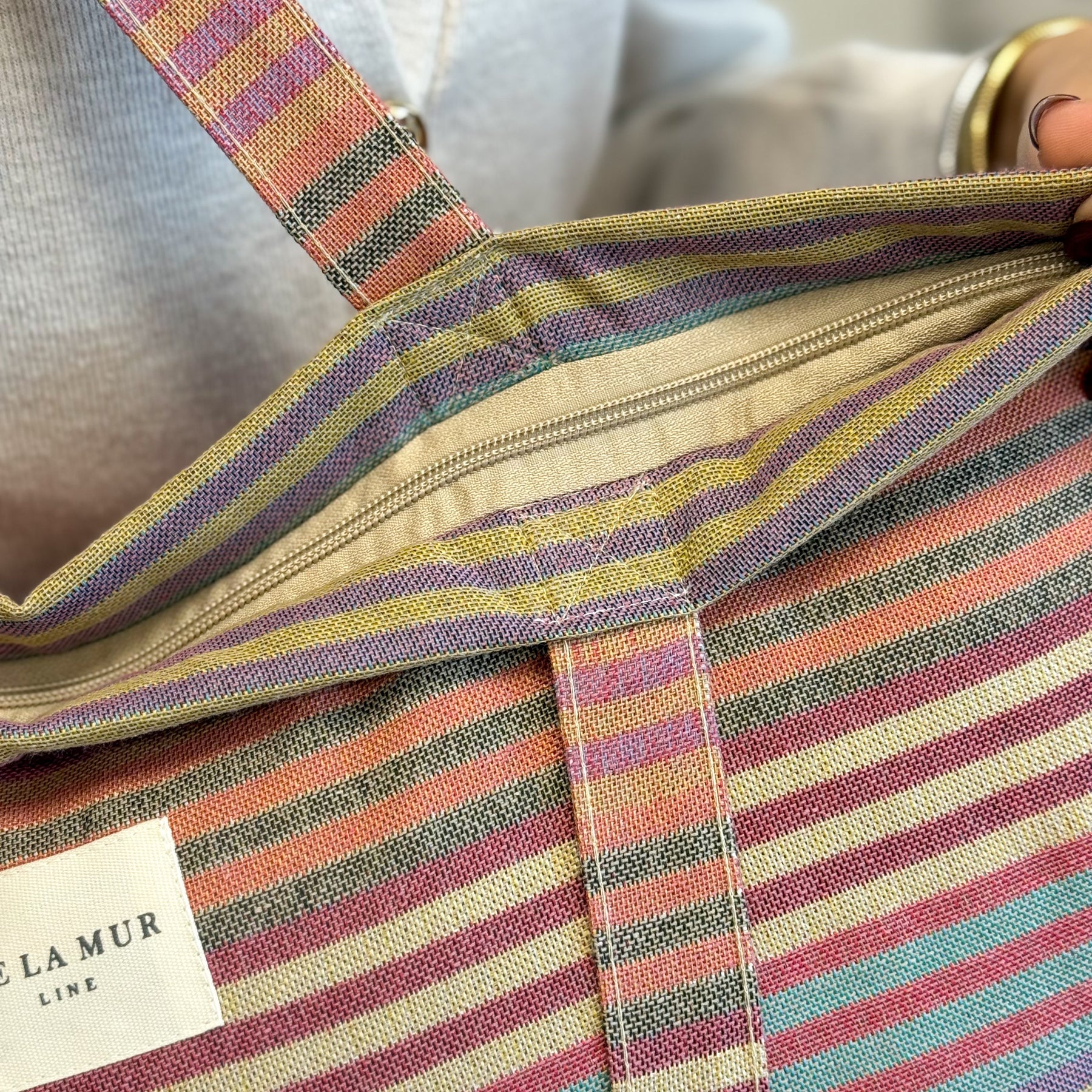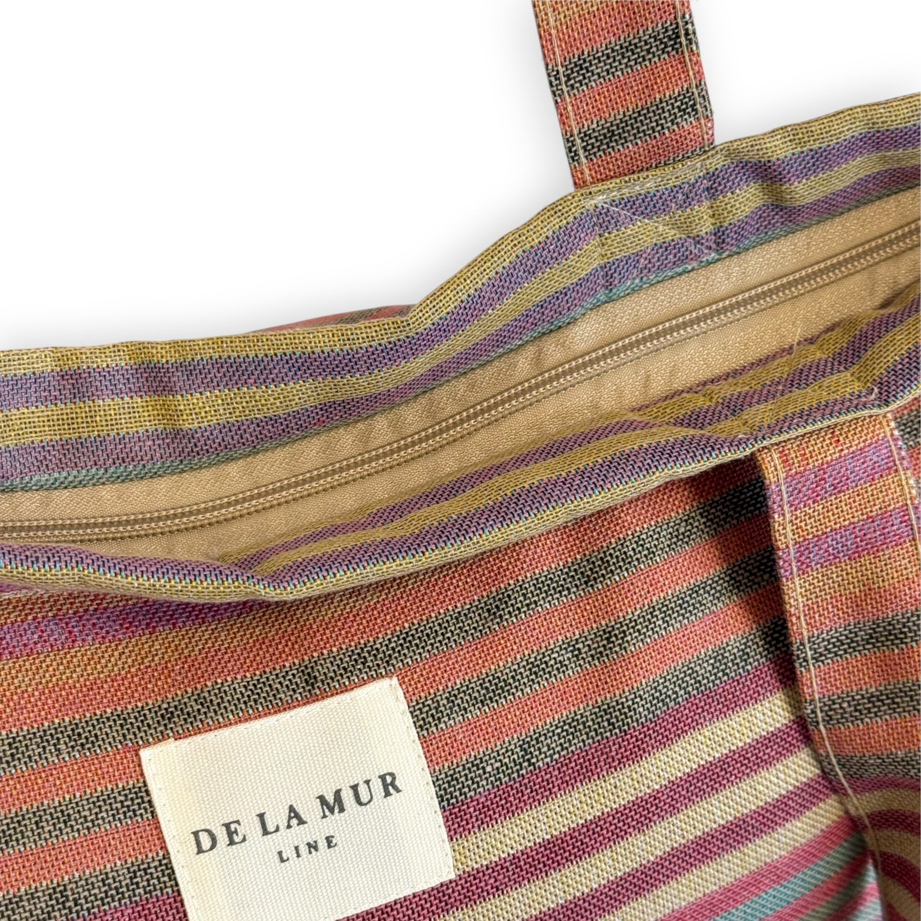 Large zippered tote bag with shoulder straps. Made from jacquard fabric (80% cotton, 20% polyester) featuring a multicolor striped pattern. Includes a top zipper closure. For proper care, we recommend hand washing in cold water and not tumble drying.