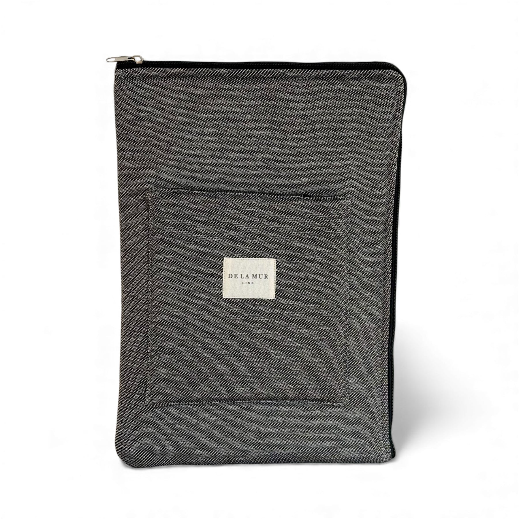 Laptop sleeve with zipper closure and exterior pocket, padded for protection. Made from thick jacquard fabric in black and dark grey tones, it combines durability with a sleek, understated look—perfect for carrying your laptop safely and in style.