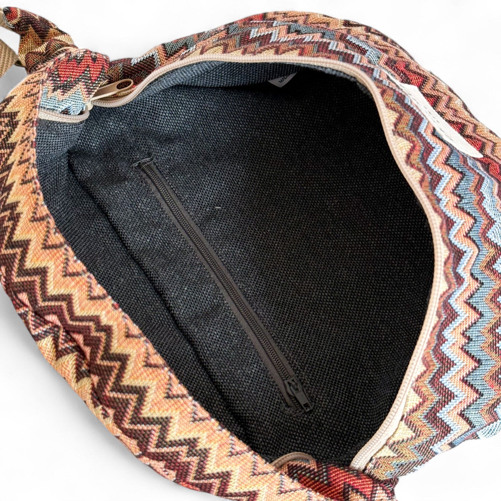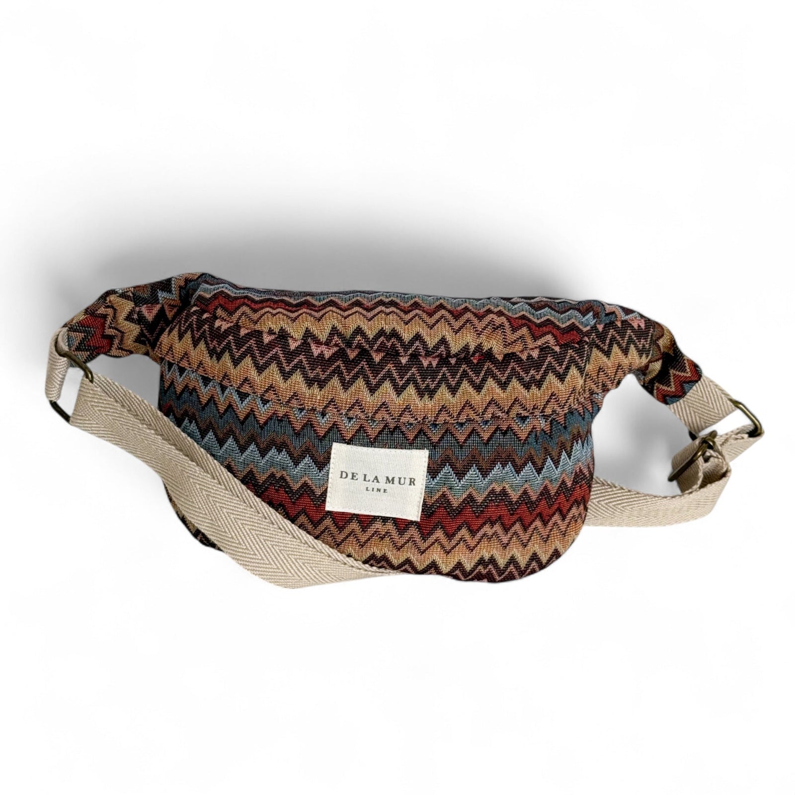 Sac banane à bandoulière avec longue bandoulière réglable en toile de coton beige à chevrons. Tissu jacquard épais à imprimé zigzag multicolore. Fermeture zippée. Poche intérieure. Doublure en tissu gris épais. Pour un entretien optimal, nous recommandons le lavage à la main à l'eau froide et l'utilisation d'un sèche-linge.