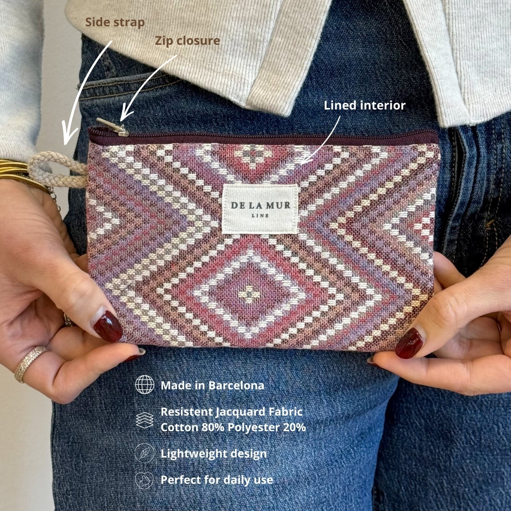 Small Makeup Bag / Coin Purse with a top zipper and a small beige cord side handle. Made from thick jacquard fabric (80% cotton, 20% polyester) with a geometric print in pink and lilac tones. Each item may vary slightly in pattern, depending on where the fabric is cut. Fully lined with thick gray fabric on the inside.