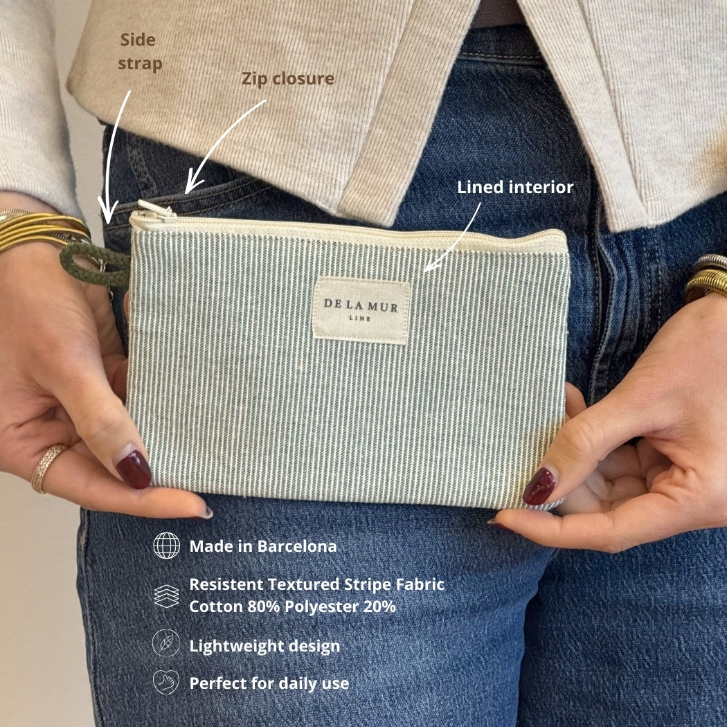 Small makeup bag / coin purse with a zipper on top and a small green cord handle on the side. Made of fine textured fabric, 80% cotton and 20% polyester, with light green stripes. Each item may have slight variations in the pattern, depending on where the fabric was cut. Lined with thick gray fabric on the inside. For proper care, hand wash in cold water and do not tumble dry.