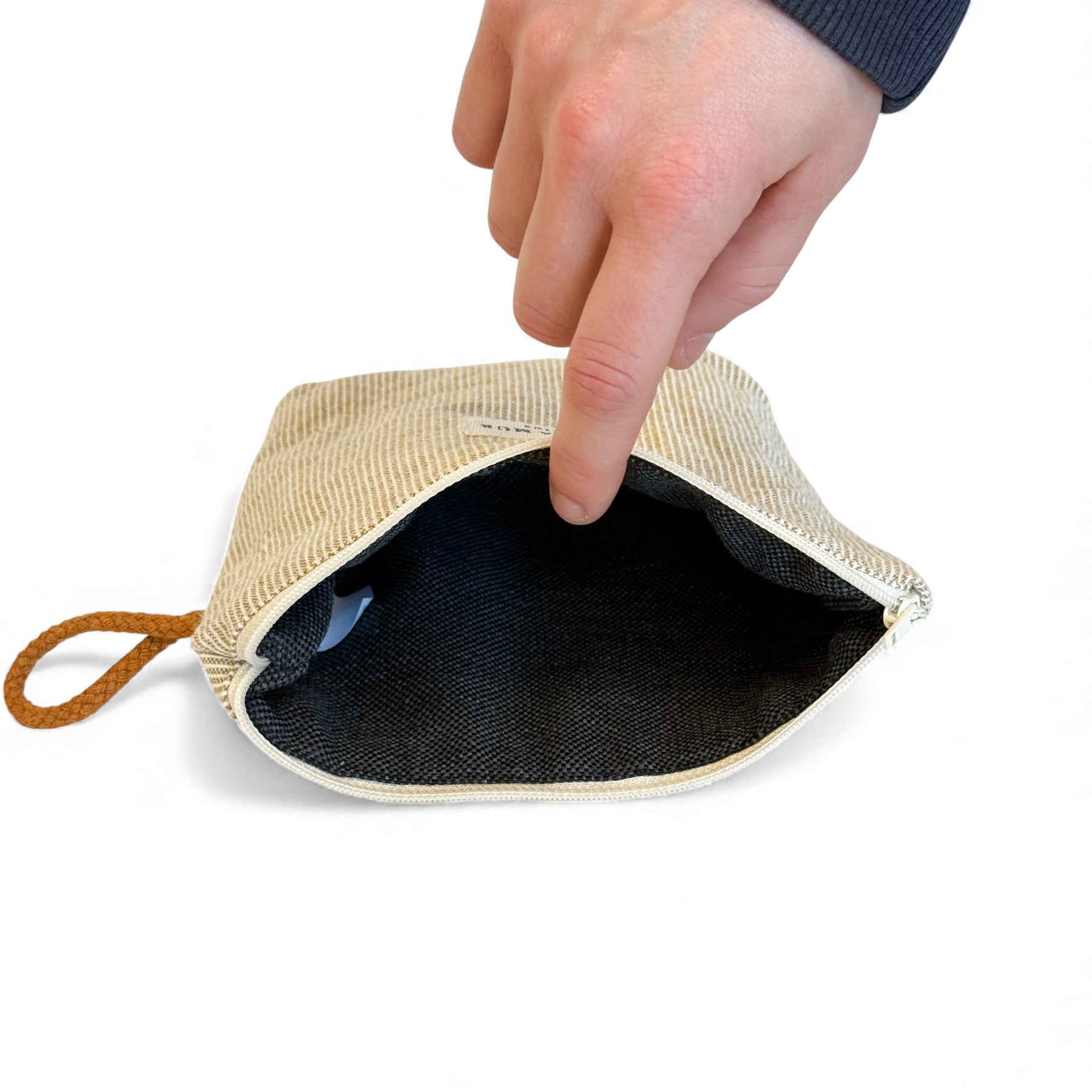 Small toiletry pouch with top zipper and rust-colored cord—perfect for organizing cosmetics, small essentials, or travel items with style.